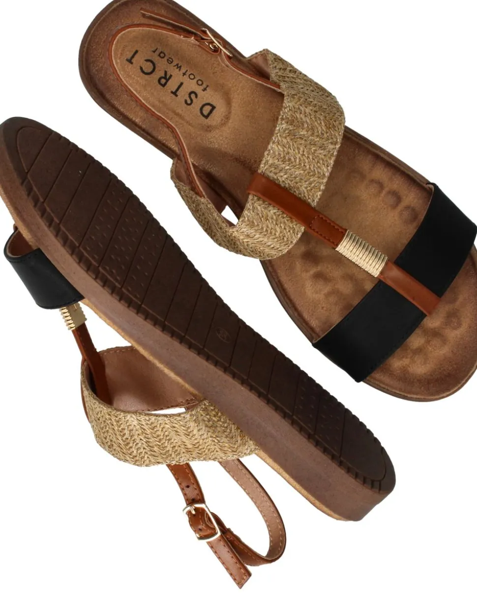 Deze stijlvolle sandaal is een perfecte mix van comfort en zomerse flair. Het model combineert zwart leer met een gevlochten goudkleurige band, wat zorgt voor een speels contrast en een chique uitstraling. Het zachte voetbed en de soepele zool bieden de hele dag door een aangenaam draagcomfort. Ideaal voor zowel een casual look als een zomerse avond uit!