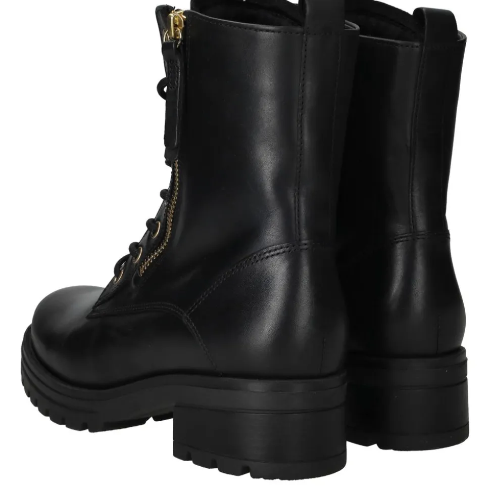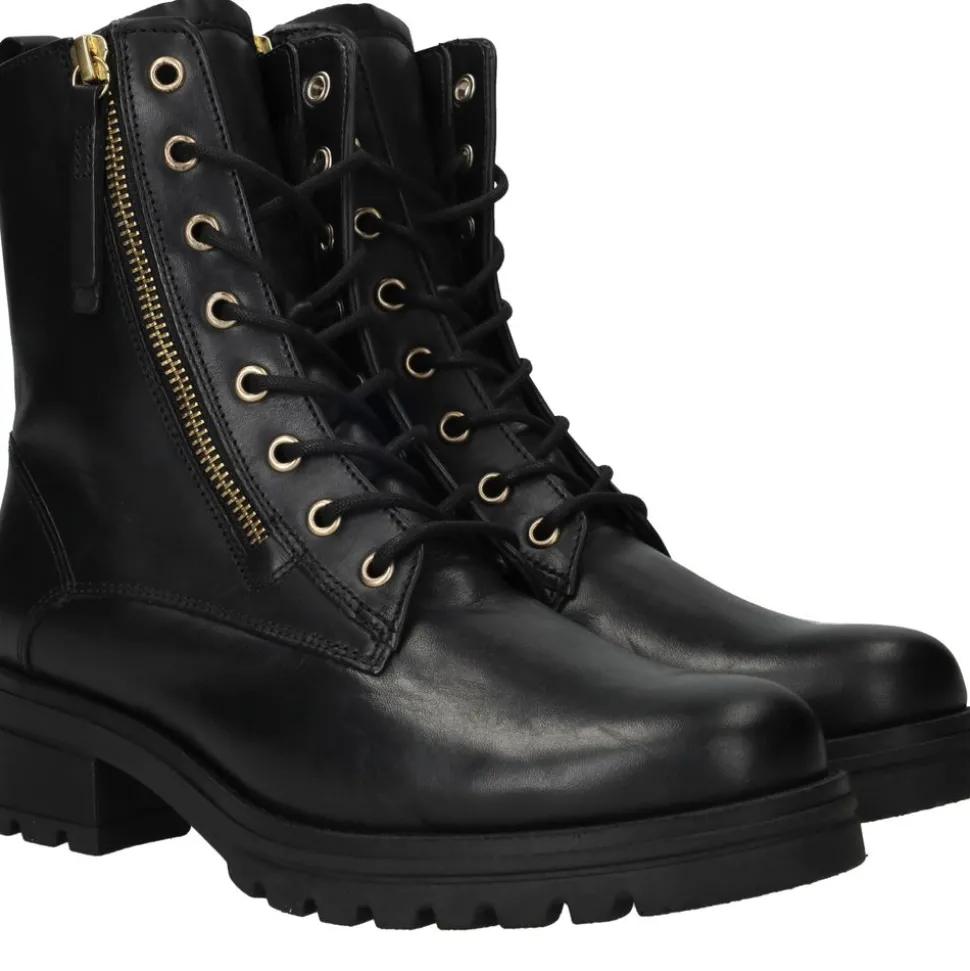 De veterboots zijn een stoere en stijlvolle keuze voor dames die comfort en mode willen combineren. Deze zwarte zijn uitgevoerd in hoogwaardig leer en hebben een robuuste zool die zorgt voor extra grip en stabiliteit. De combinatie van veters en een opvallende goudkleurige ritssluiting maakt de laars praktisch én modieus.