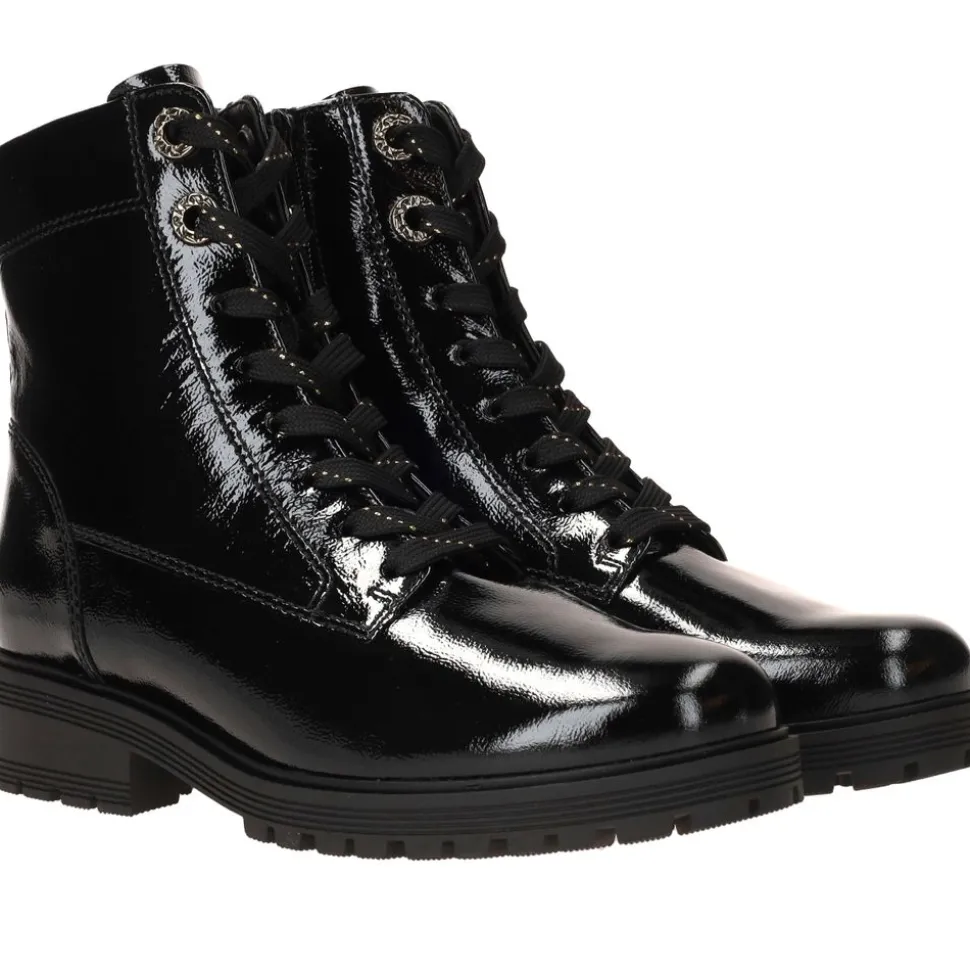 De veterboots zijn een stijlvolle keuze voor dames die comfort en mode willen combineren. Deze zwarte zijn uitgevoerd in lakleer en hebben een H-voetbreedte, waardoor ze ook geschikt zijn voor bredere voeten. De glanzende afwerking en robuuste profielzool maken ze ideaal voor zowel dagelijks gebruik als voor een trendy uitstraling.