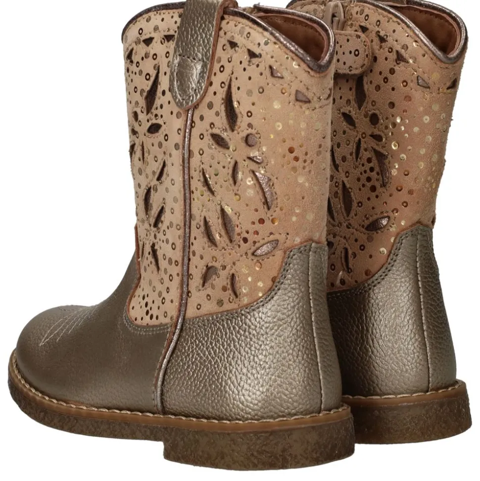 Dit IK-KE laarsje voor meiden combineert een stoere westernlook met een vleugje glamour. Uitgevoerd in goudkleurig metallic leer en suède, heeft deze boot een uniek uitgesneden motief op de schacht. Het uitneembare voetbed zorgt voor extra comfort en maakt het mogelijk om eigen inlegzolen te gebruiken. Dankzij de ritssluiting is de laars eenvoudig aan en uit te trekken.
