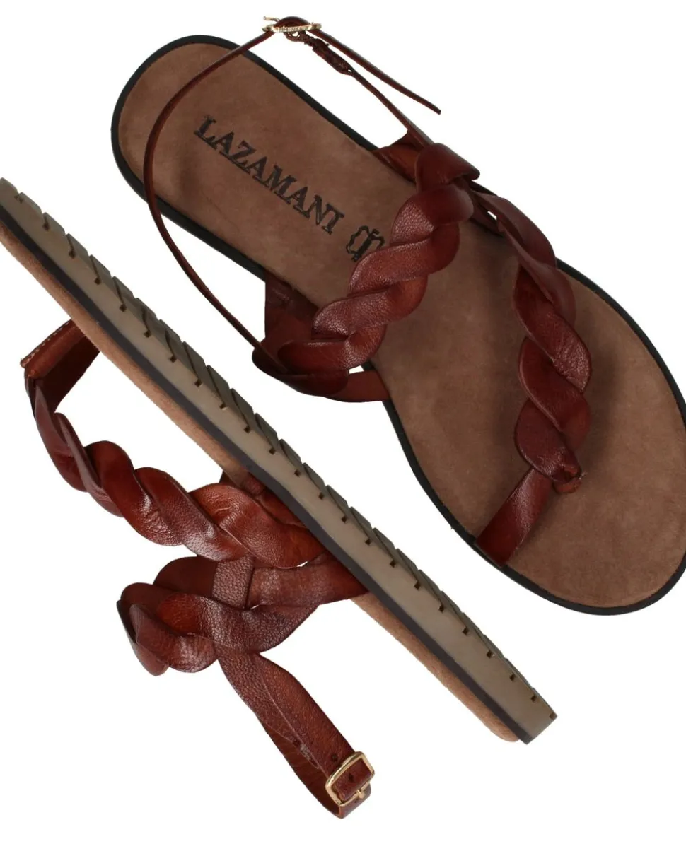 Deze zomerse sandaal van het merk Lazamani straalt pure bohemian charme uit. Het model is uitgevoerd in soepel bruin leer en is afgewerkt met speelse gevlochten bandjes voor een trendy look. De platte zool met zacht voetbed zorgt voor ultiem draagcomfort tijdens warme dagen. Perfect om te combineren met luchtige zomerjurken of een casual outfit!
