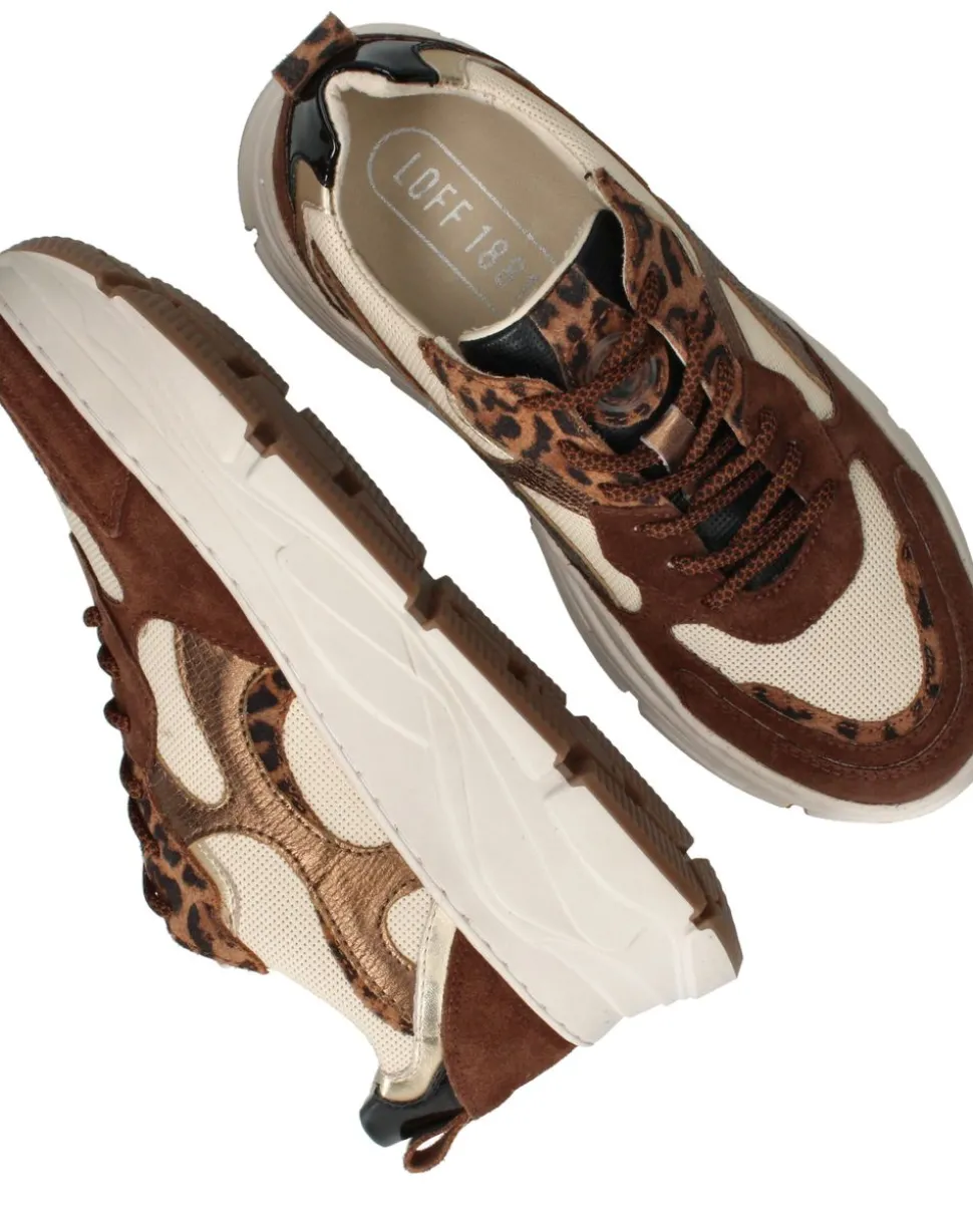 Deze trendy LOFF 1881 sneaker voor dames is een echte eyecatcher dankzij het gebruik van diverse materialen en de opvallende panterprint. Het bovenwerk bestaat uit een combinatie van suède, leer en metallic leer, wat zorgt voor een luxe en modieuze uitstraling. De voering van leer en textiel biedt comfort en ademend vermogen, waardoor de sneaker geschikt is voor dagelijks gebruik.