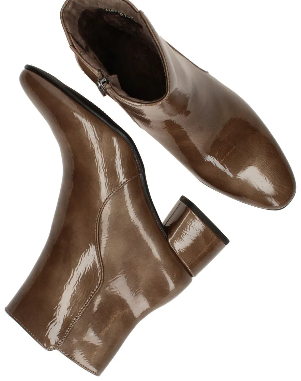 - Het kunstleer met subtiele glans geeft dit taupe enkellaarsje een moderne, vrouwelijke uitstraling.