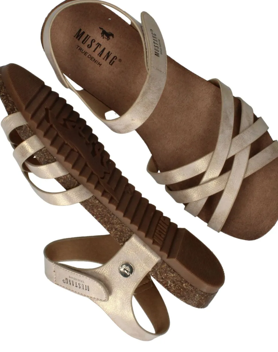 Loop comfortabel en stijlvol de zomer door met de Mustang sandalen, model 1307811. Deze damessandalen in een prachtige gouden kleur zijn vervaardigd uit hoogwaardig imitatieleer, wat zorgt voor een zachte en luxe uitstraling. De sandalen zijn voorzien van een comfortabele sleehak en een zachte binnenzool, waardoor je de hele dag comfortabel kunt lopen. De gekruiste bandjes en de verstelbare klittenbandsluiting geven deze sandalen een unieke en trendy touch.