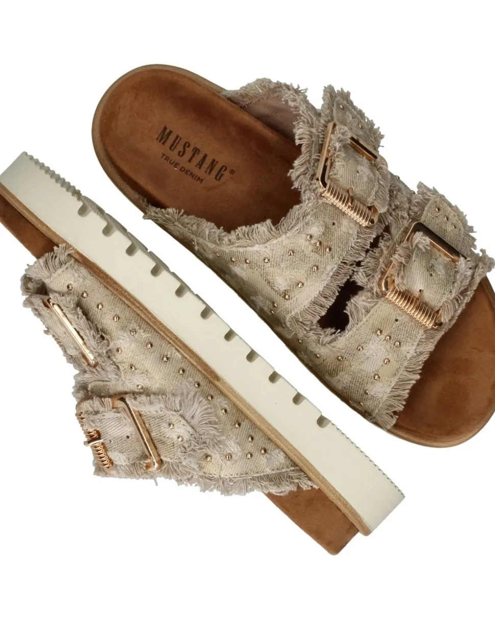 Deze trendy van zijn een perfecte mix van boho en comfort. De dubbele band van beige met rafelranden, studs en goudkleurige gespen geeft een unieke en stoere uitstraling. Voor die houden van opvallend maar comfortabel schoeisel. De zachte zool met profiel zorgt voor goede grip en loopcomfort, zelfs op warme dagen.