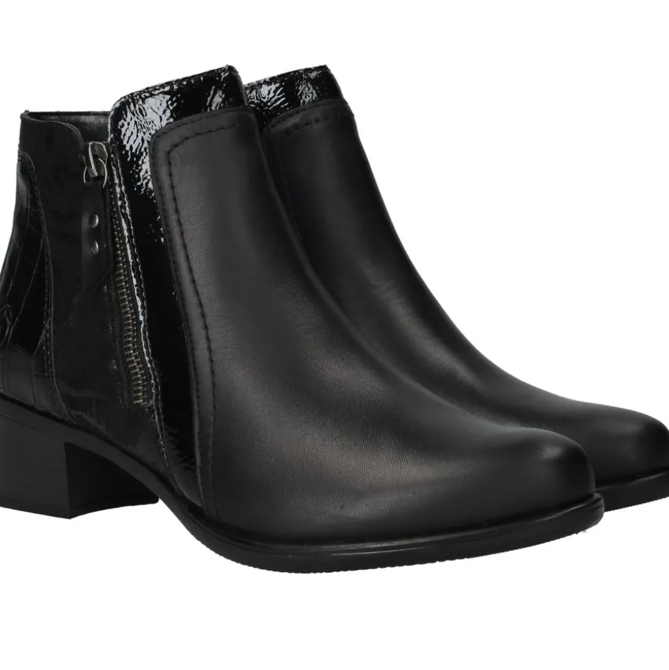 Deze elegante in zwart leer en textiel zijn een veelzijdige en stijlvolle keuze. Het subtiele contrast tussen het gladde leer en het textiele detail geeft de laarsjes een unieke en moderne uitstraling. De stevige hak biedt stabiliteit en comfort, terwijl de comfortabele zorgt voor een fijne pasvorm. Perfect voor die mode en praktisch gemak willen combineren.