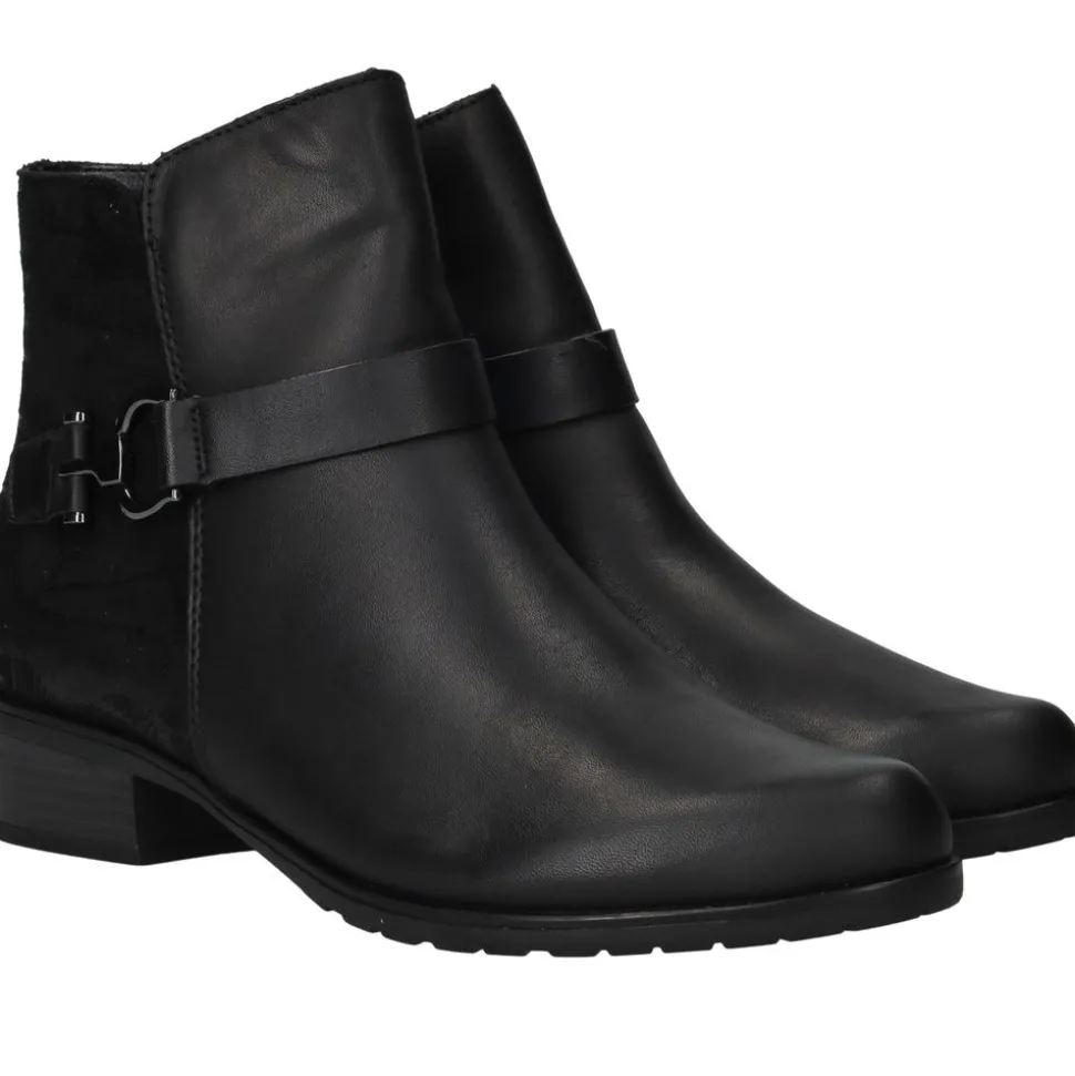 Deze elegante in zwart leer en textiel zijn een stijlvolle en veelzijdige keuze. Het gladde leer aan de voorkant en het subtiele textielpatroon aan de achterkant geven de laarsjes een moderne en luxe uitstraling. Dankzij de comfortabele geniet je van een prettige pasvorm. Perfect voor die mode en comfort willen combineren.
