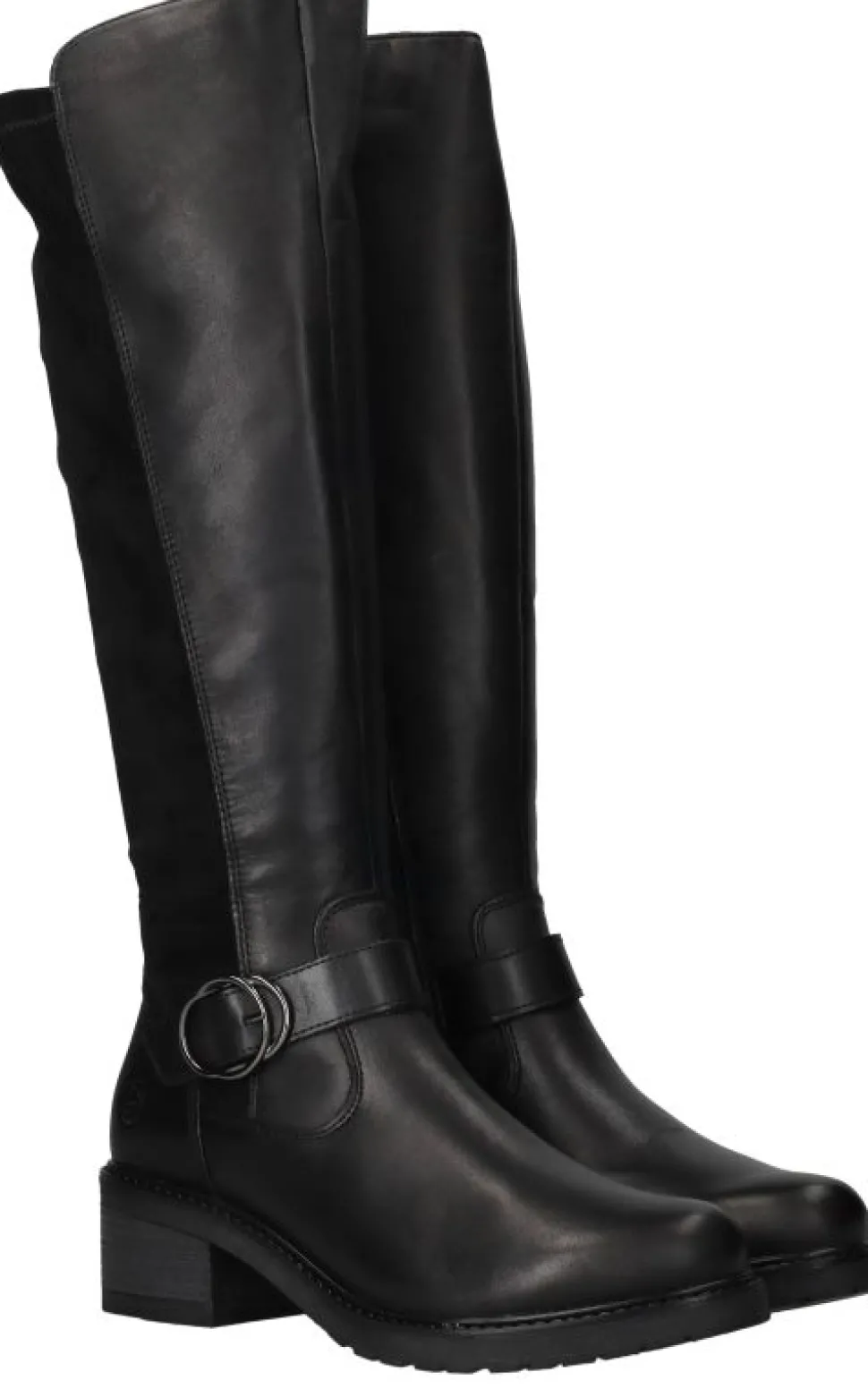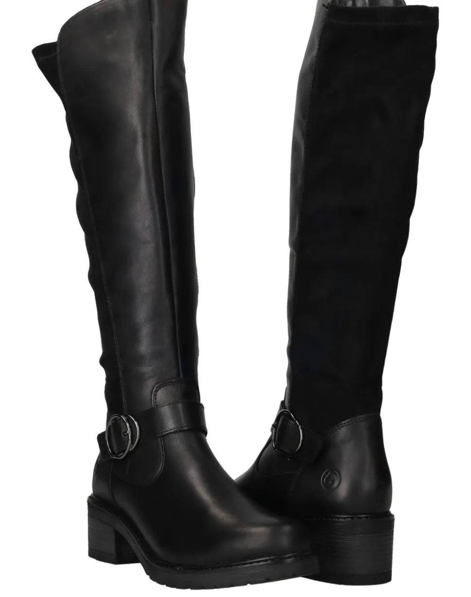 Deze elegante in zwart leer en kunstsuède combineren klasse met comfort. De hoge schacht geeft een verfijnde uitstraling en dankzij de stevige zool geniet je van extra stabiliteit. De combinatie van leer en kunstsuède zorgt voor een stijlvolle contrastlook. Met de comfortabele zijn deze laarzen ideaal voor die houden van elegantie en praktisch draaggemak.