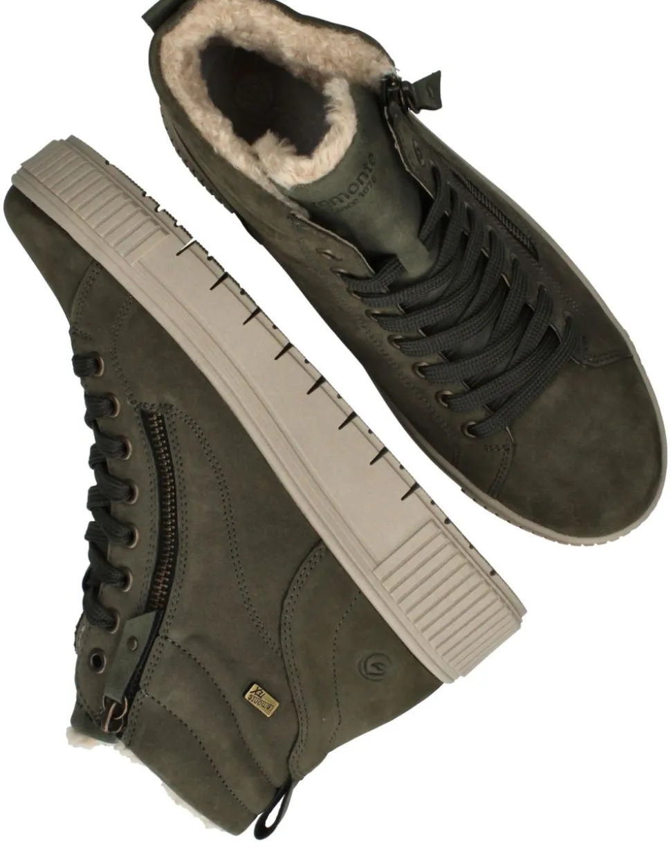 Deze groene Remonte sneakers van nubuck en warme voering verdienen de juiste verzorging. Bescherm ze met de of de . Voor reiniging gebruik je de . Werk het materiaal mooi op met een en verwijder vlekken met de . Zo blijven jouw sneakers langer mooi en heerlijk comfortabel.