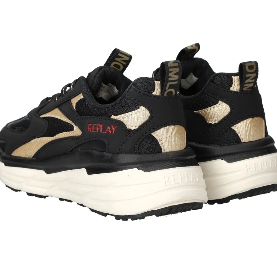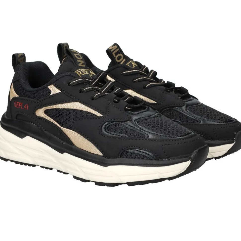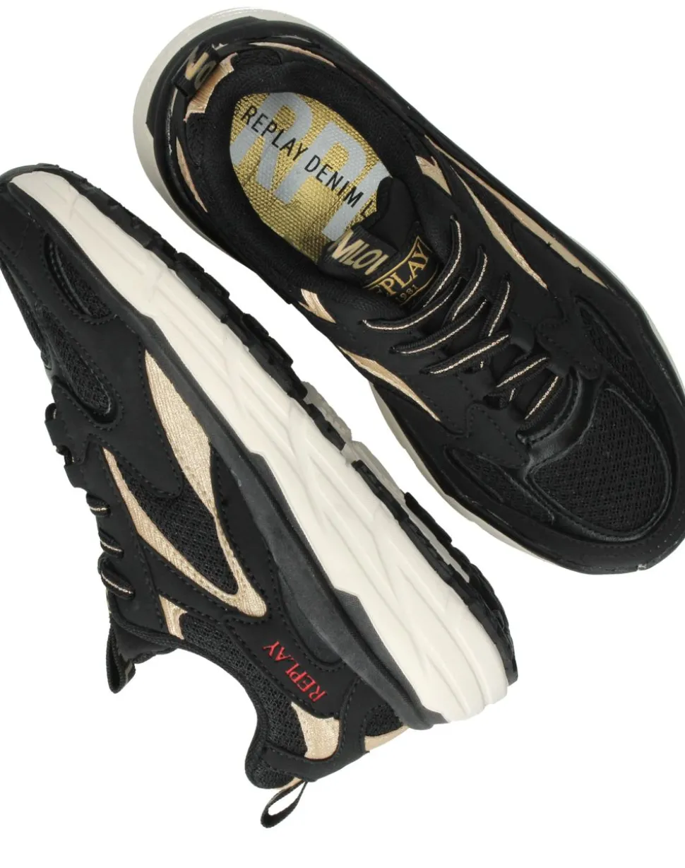Deze Replay Christal JR 6 sneaker voor meiden is uitgevoerd in zwart kunstleer en textiel. Dankzij de sportieve uitstraling en de opvallende gouden details is dit de perfecte sneaker voor een trendy look.