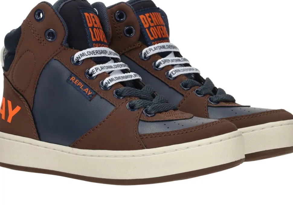 - Deze hoge sneakers hebben opvallende oranje accenten.