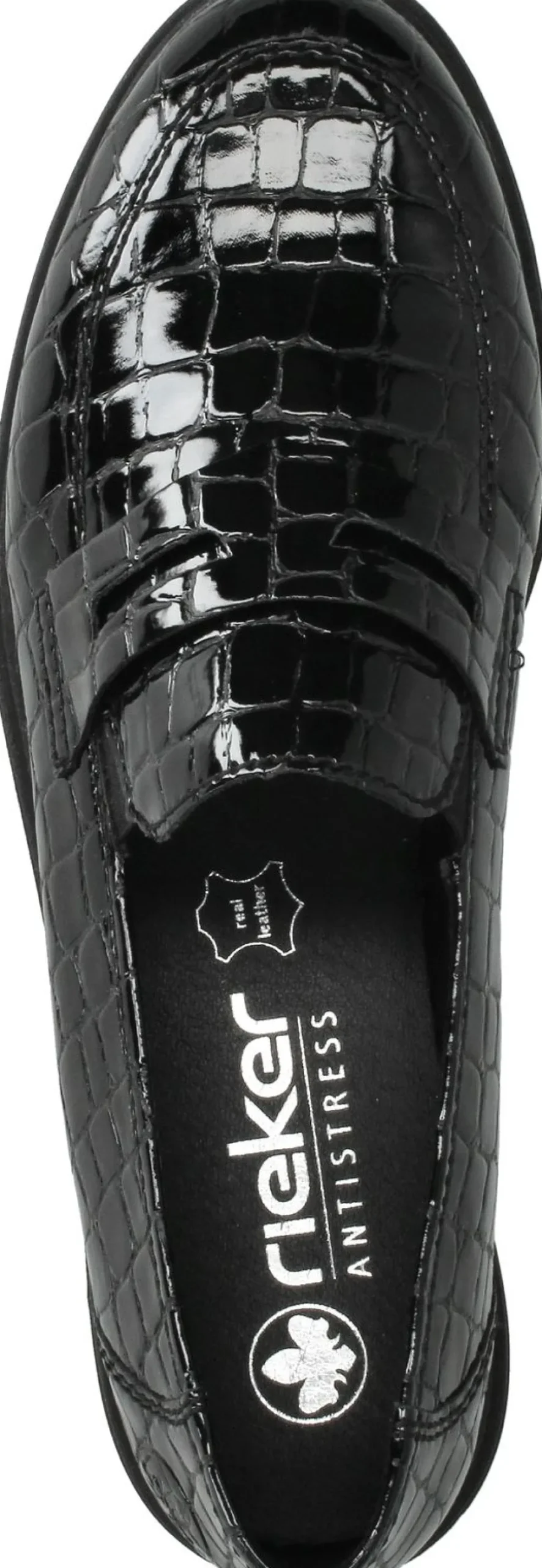 Op zoek naar een elegante die direct opvalt? Deze zwarte loafers van Rieker combineren klasse met comfort. De glanzende krokolook in lak-kunstleer maakt elke outfit stijlvol, of je ze nu draagt naar kantoor of een etentje. Perfect voor met een smallere voetbreedte F die niet willen inleveren op modegevoel.