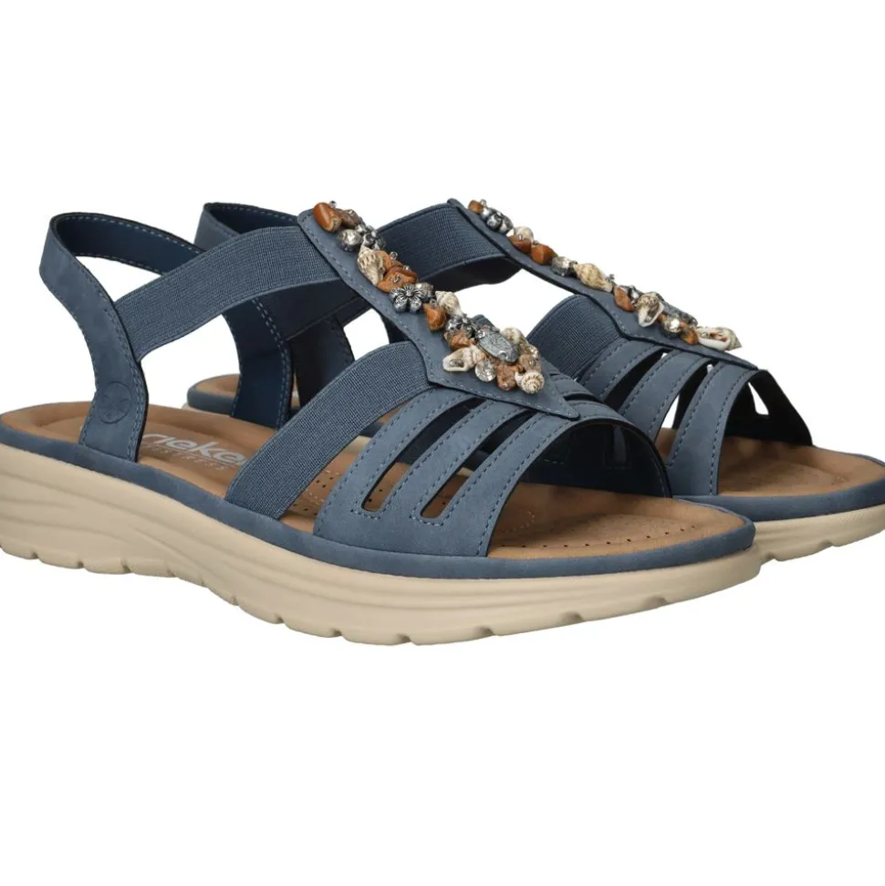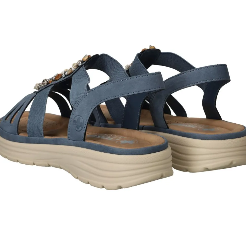 Loop comfortabel en stijlvol de zomer door met de Rieker sandalen, model V8549. Deze damessandalen in een prachtige blauwe kleur zijn vervaardigd uit een combinatie van synthetisch materiaal en textiel, wat zorgt voor een comfortabele pasvorm. De sandalen zijn voorzien van een comfortabele zool en een zachte binnenzool, waardoor je de hele dag comfortabel kunt lopen. De opvallende sierstenen en de verstelbare bandjes geven deze sandalen een unieke en trendy touch.