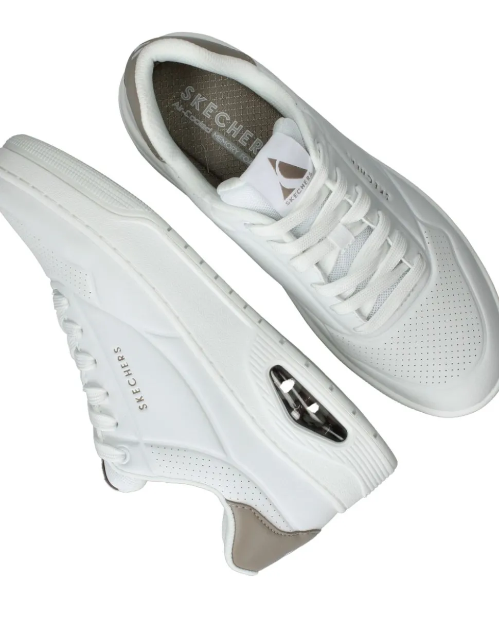 Met de van kies je voor een stijlvolle en comfortabele look. Deze witte Skechers Uno Court Fast Break is een moderne variant op de klassieke tennissneaker, met een buitenkant van kunstleer en een ademende textielvoering. De dempende luchtzool biedt extra ondersteuning voor dagelijks comfort, ideaal voor dames met een actieve levensstijl.