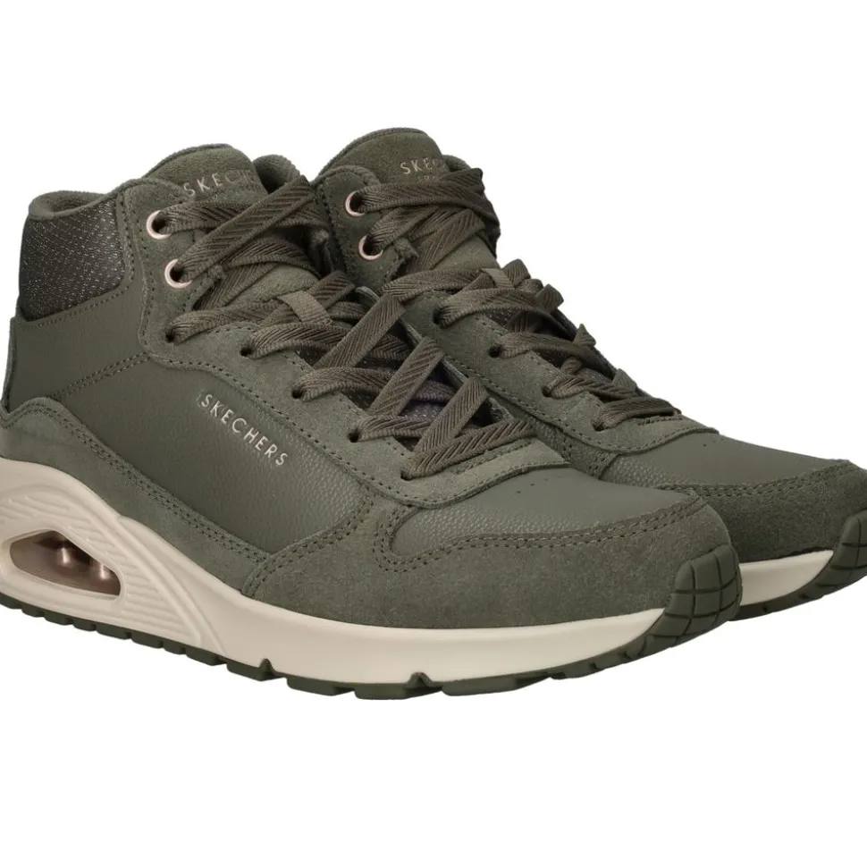 De groene Skechers Uno veterboot voor dames biedt een sportieve look met een moderne twist. Uitgevoerd in een combinatie van suède en leer straalt deze boot een stoere maar stijlvolle uitstraling uit. De textielen voering zorgt voor comfort bij dagelijks gebruik, terwijl de stevige zool en veter-sluiting optimale ondersteuning geven.