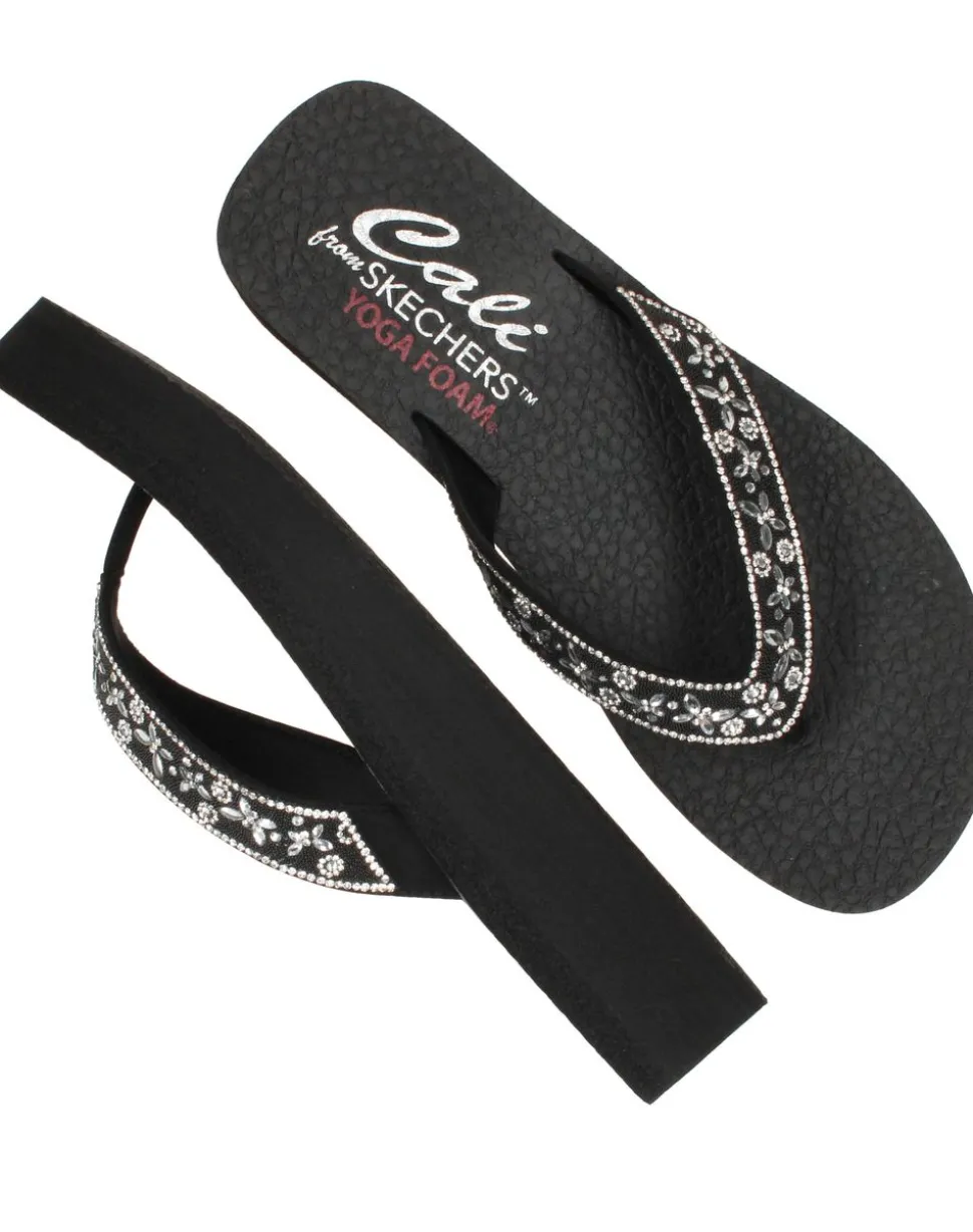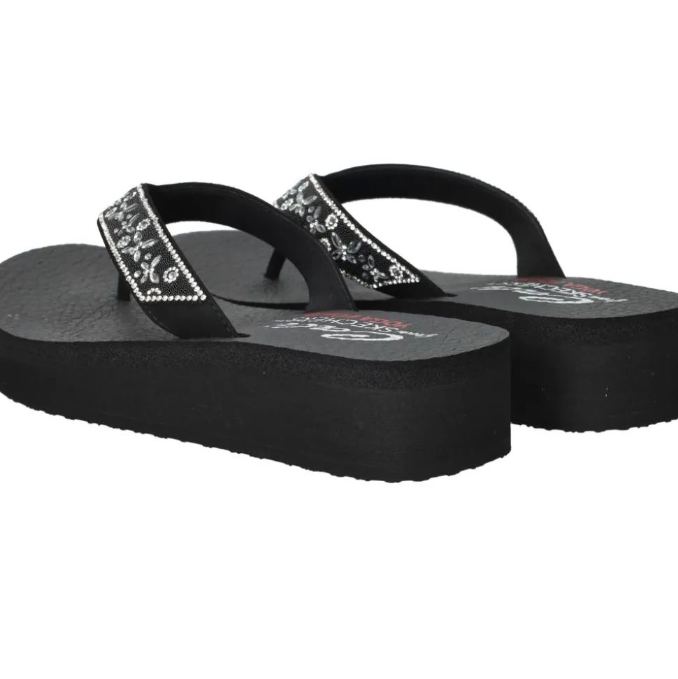 Voeg een vleugje glamour toe aan je zomerse look met de Skechers Vinyasa teenslippers. Deze damesslippers in een diepe zwarte kleur zijn vervaardigd uit zacht textiel, wat zorgt voor een comfortabele pasvorm. De teenslippers zijn voorzien van een comfortabele zool en een zachte binnenzool, waardoor je de hele dag comfortabel kunt lopen. De band is versierd met glinsterende details, waardoor de slippers een unieke en elegante uitstraling hebben.