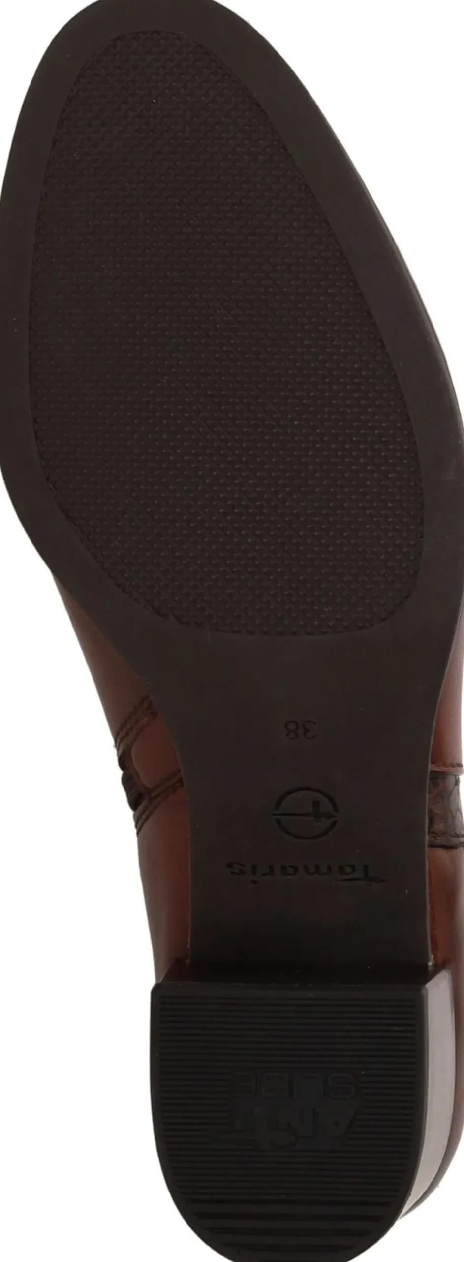 - Belangrijke kenmerken zijn de stabiele blokhak, het luxe cognackleurige leer en de subtiele reliëfafwerking.