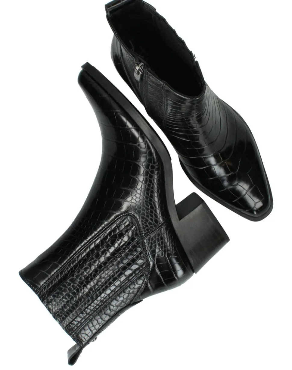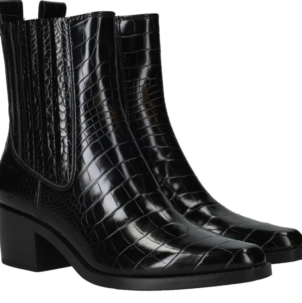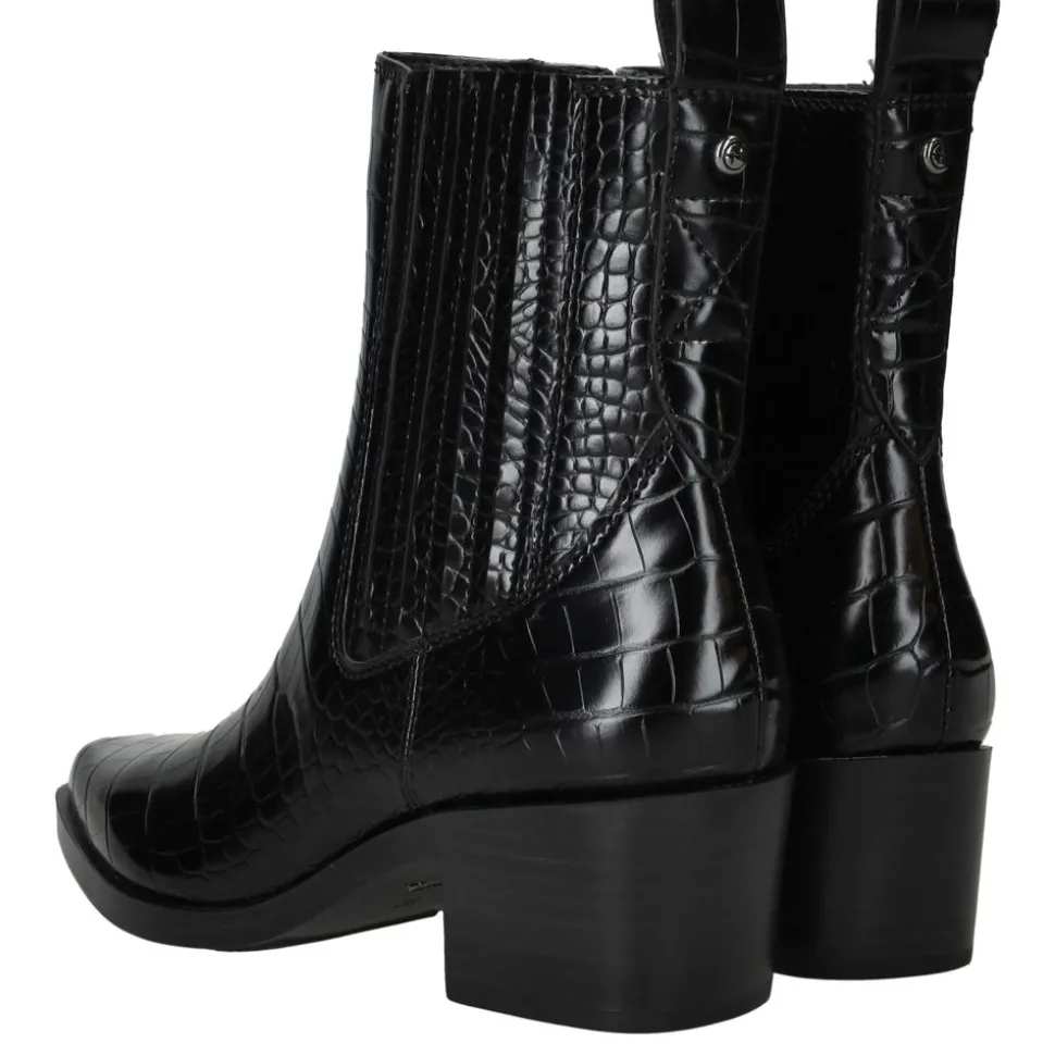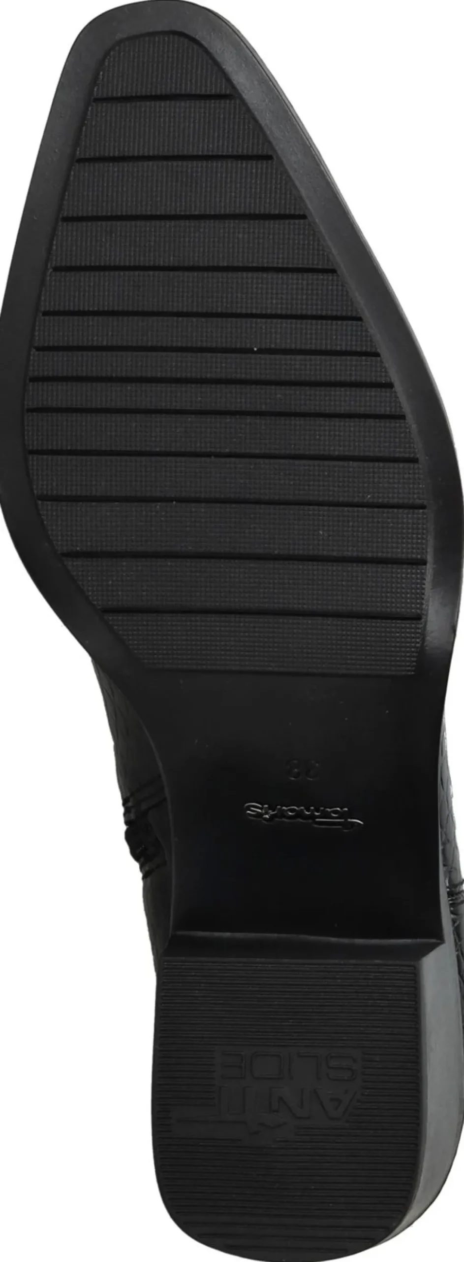 Deze Tamaris westernboot in zwart kunstleer combineert een trendy dierenprint met een stoere westerne look. De blokhak en de elegante belijning maken deze enkellaars veelzijdig en stijlvol, perfect voor zowel casual als geklede outfits.