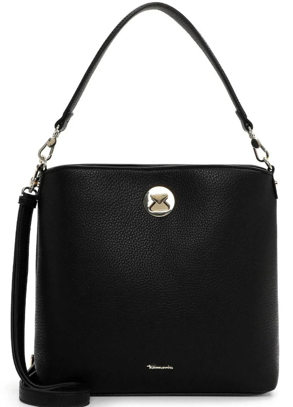 De Tamaris Gladis handtas in zwart is een stijlvolle blikvanger met een moderne en vrouwelijke uitstraling. Deze tas is gemaakt van hoogwaardig kunstleer en voorzien van elegante gouden details die de luxe look versterken. Dankzij het praktische ontwerp met zowel een hand- als schouderhengsel kun je de tas op verschillende manieren dragen. Het ruime hoofdvak met ritssluiting biedt voldoende ruimte voor al je dagelijkse essentials.