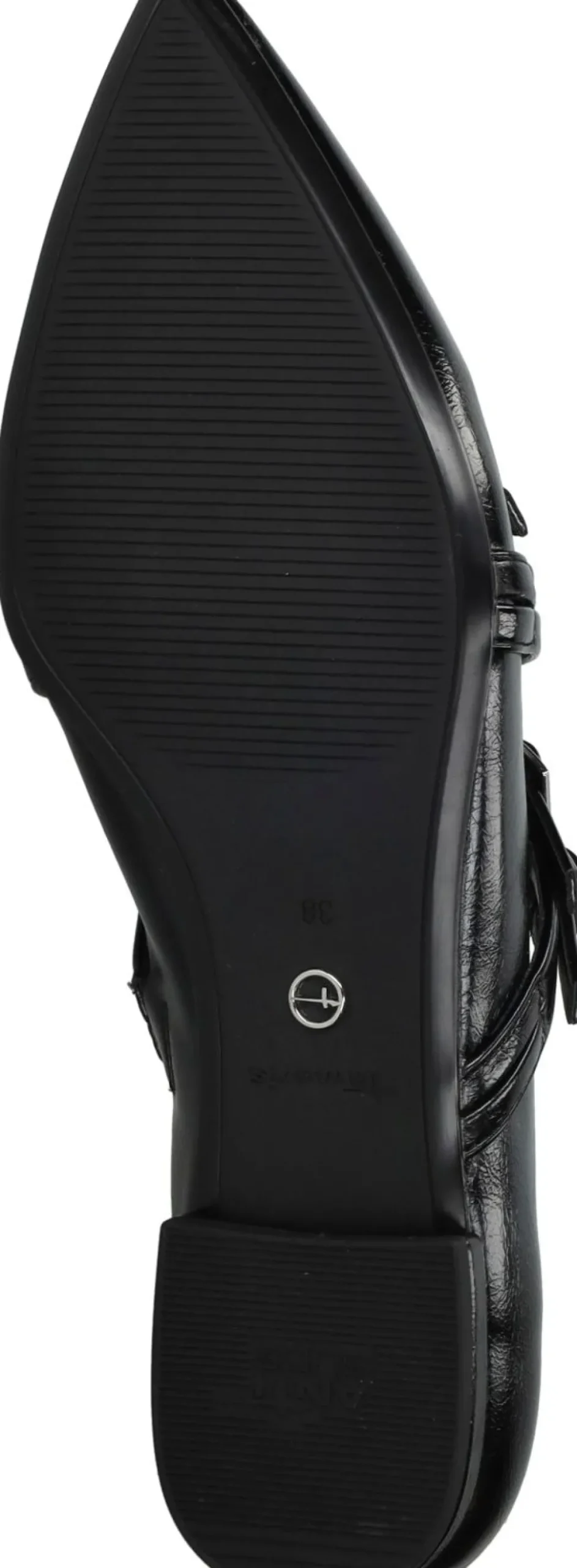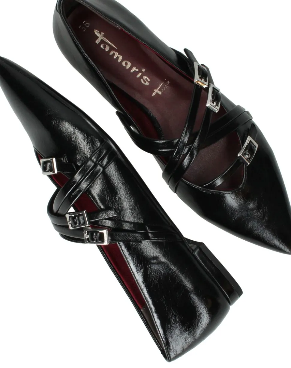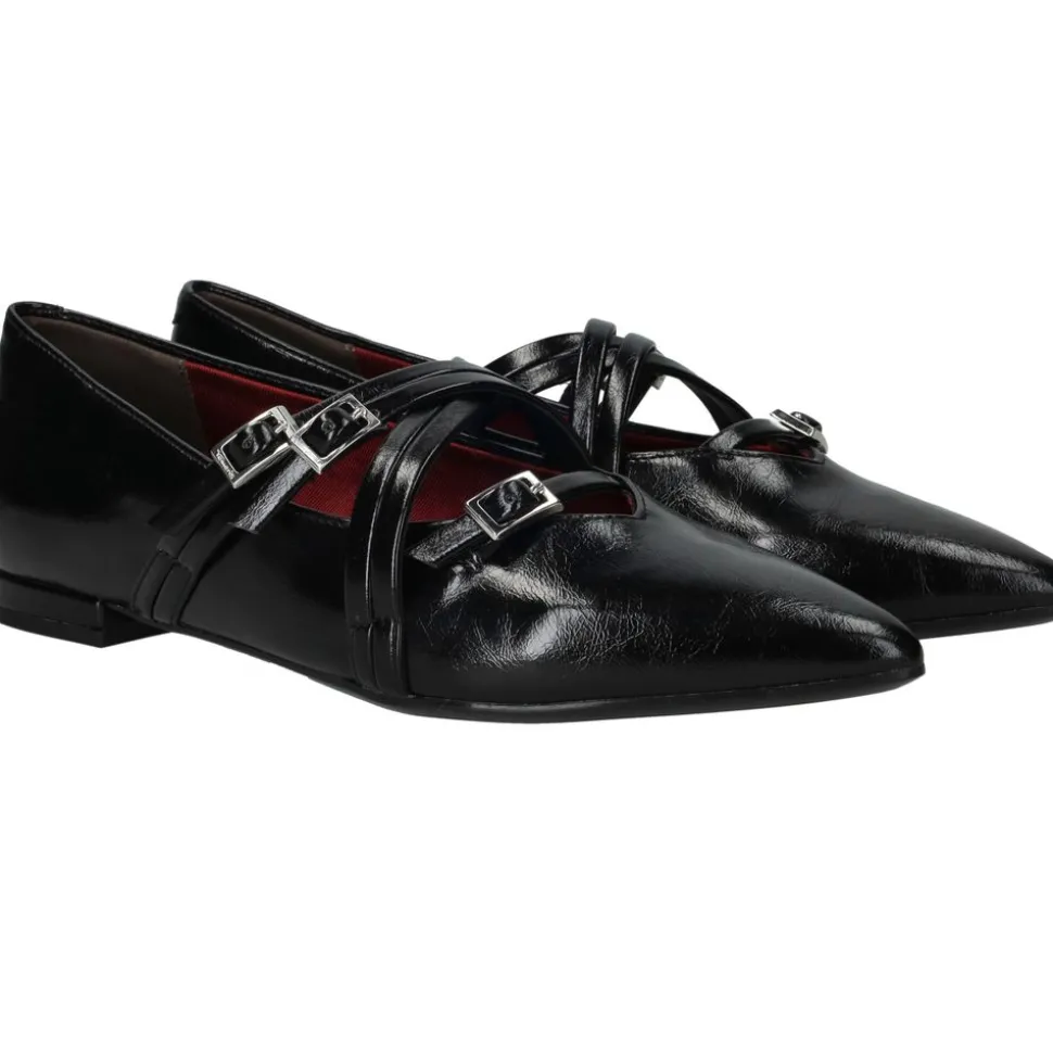 Deze zwarte combineren een verfijnde uitstraling met een moderne twist. Het kunstleer heeft een subtiele glans en de puntige neus zorgt voor een elegante look. De gekruiste bandjes met gespsluiting geven de schoen extra karakter én zorgen ervoor dat hij stevig aan de voet blijft zitten. Met een zachte synthetische voering en voetbreedte G zijn ze ideaal voor stijl én comfort.