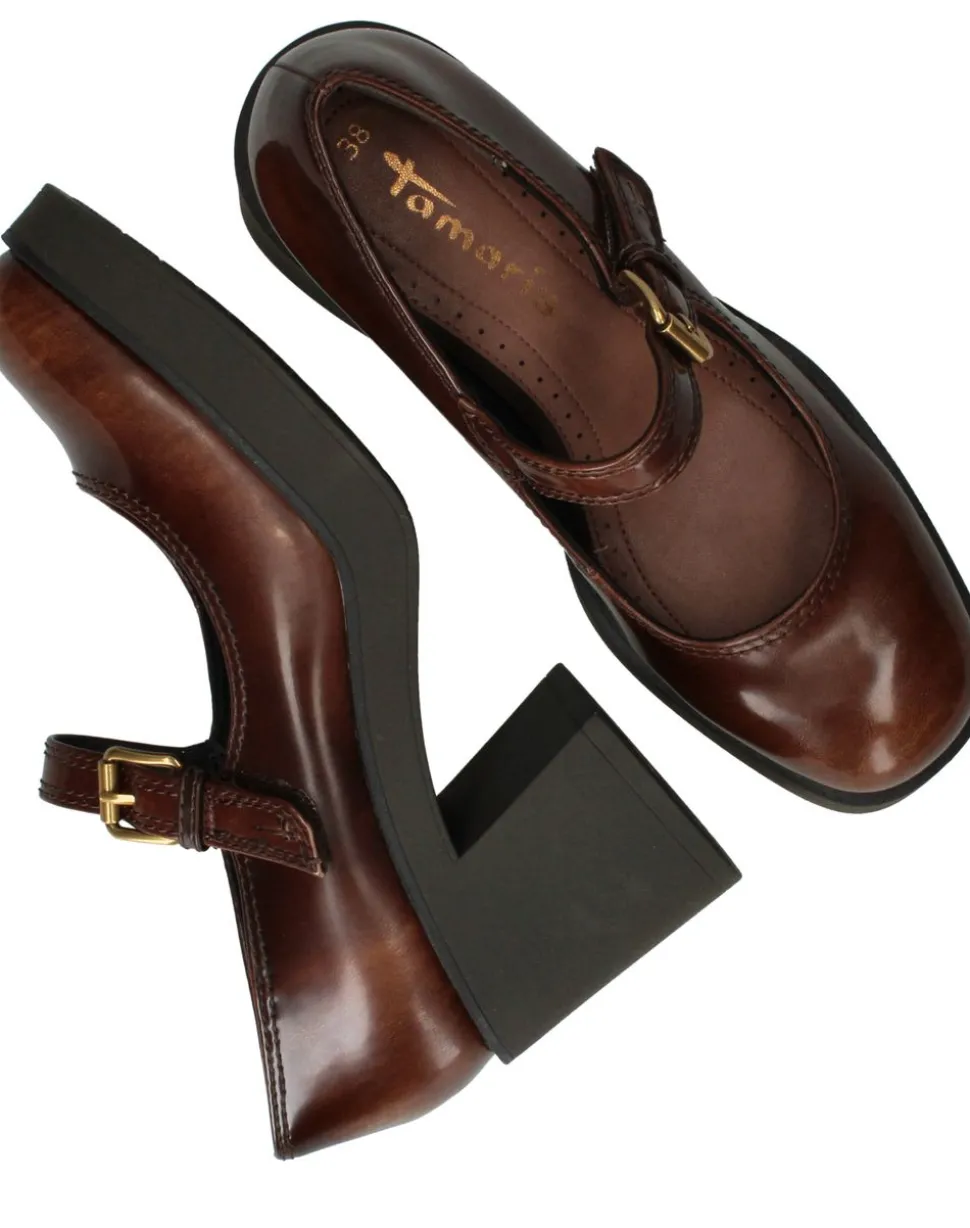 Deze prachtige Tamaris pump voor dames in een warme, glanzende bruine tint geeft iedere outfit een modieuze touch. De siergesp met klittenbandsluiting combineert stijl met gemak en zorgt voor een subtiel detail dat meteen in het oog springt. Dankzij de stevige blokhak geniet je van een comfortabele pasvorm, terwijl het synthetische materiaal aan de buitenkant in combinatie met de zachte synthetische- en textielvoering ervoor zorgt dat je deze schoenen de hele dag moeiteloos draagt.