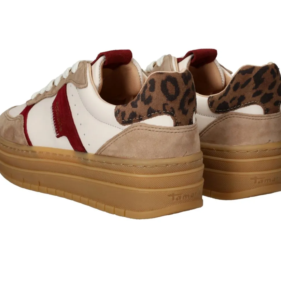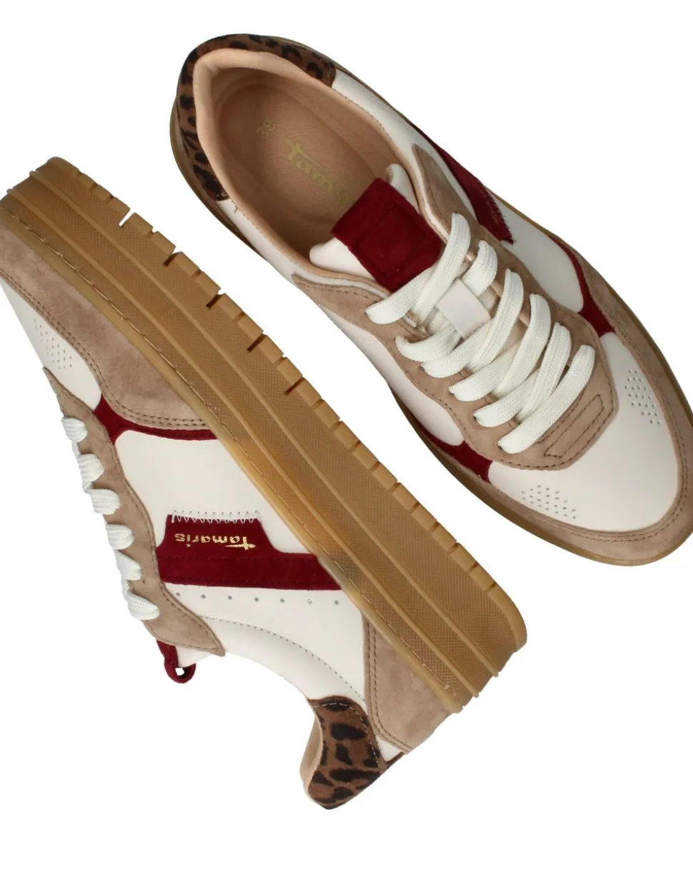 Deze Tamaris voor dames is een sportieve en stijlvolle keuze voor elke dag. De combinatie van leer en suède in warme beige en rode tinten zorgt voor een eigentijdse look, terwijl de dikke zool extra comfort biedt. Dankzij de stevige vetersluiting ervaar je goede ondersteuning bij elke stap. Deze sneaker is niet alleen mooi, maar ook praktisch dankzij de ademende -kwaliteit en comfortabele pasvorm.