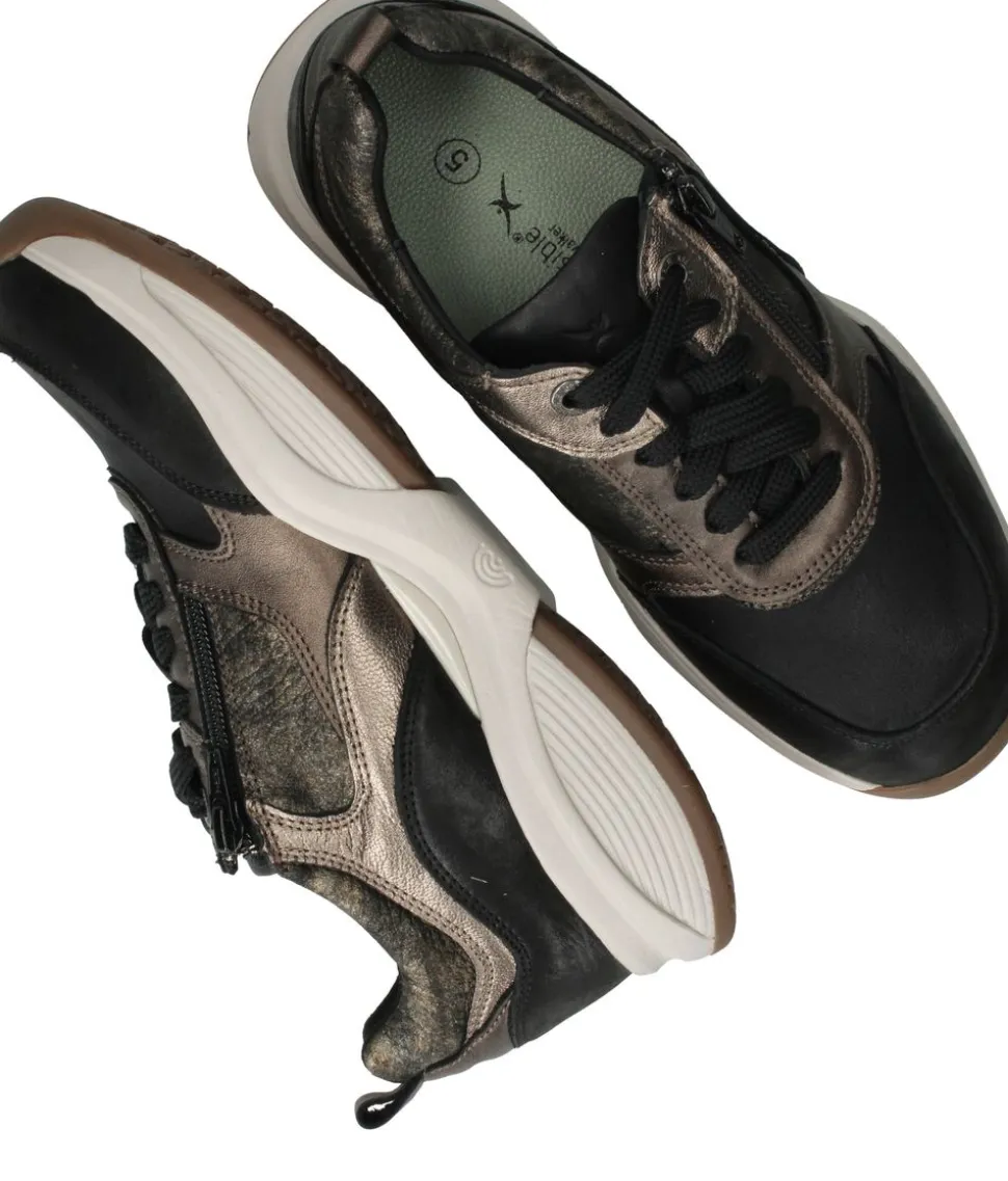 De Xsensible SWX19 is een sportieve én elegante sneaker voor dames die graag stijl combineren met comfort. De rijke mix van zwart met bronskleurig metallic leer geeft de schoen een moderne, luxueuze uitstraling. Dankzij de kenmerkende Stretchwalker-zool loop je soepeler dan ooit – elke dag opnieuw.