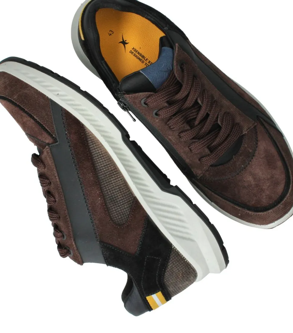 De Xsensible Yukon sneaker combineert een stoere uitstraling met ongeëvenaard comfort. Deze sportieve herenschoen is uitgevoerd in bruin textiel en leer, afgewerkt met zwarte details en een subtiel kleuraccent op de hiel. Perfect voor zowel casual outfits als een actieve levensstijl.