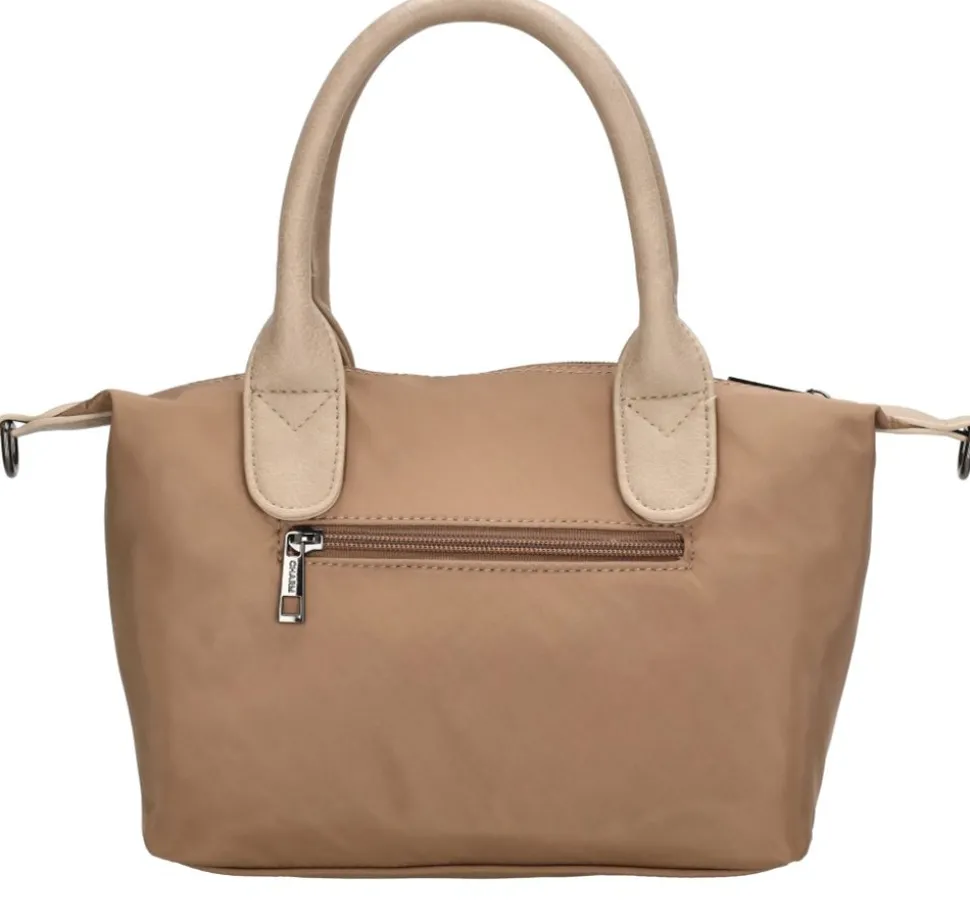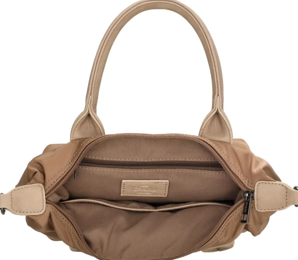 Deze handtas uit de damestassen collectie van Charm is gemaakt van waterafstotend synthetisch materiaal in een zachte karamelkleur, met contrasterende lichtbeige handgrepen in kunstleer. Een praktische en stijlvolle tas die je elke dag opnieuw wilt dragen.