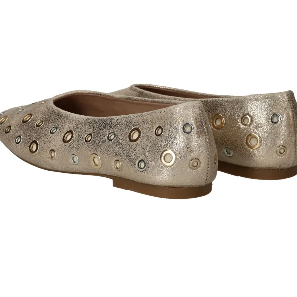 Deze sprankelende ballerina is perfect voor wie houdt van een vleugje glamour. Het model is uitgevoerd in glanzend goudkleurig leer en is versierd met speelse metalen ringen in zilver- en goudtinten. Dankzij de platte zool en het zachte voetbed biedt deze ballerina niet alleen stijl, maar ook comfort. Ideaal voor feestelijke gelegenheden of om je dagelijkse outfit een extra touch te geven!