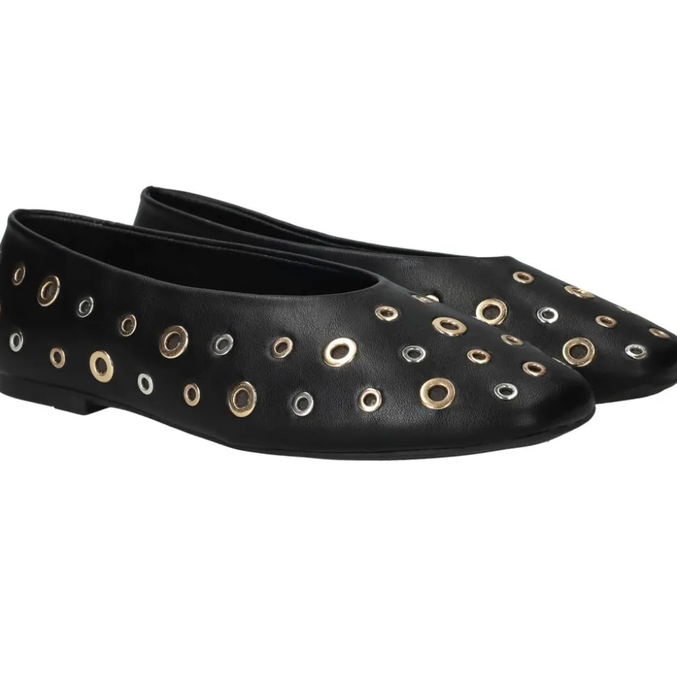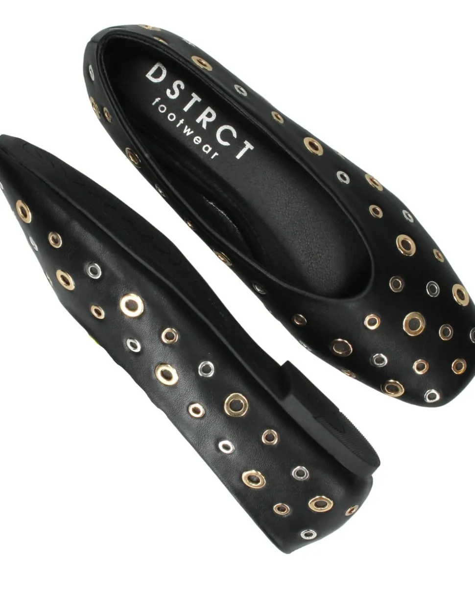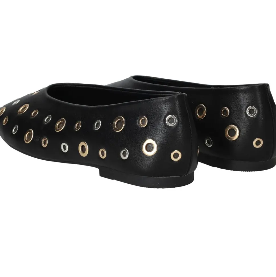 Deze opvallende ballerina is een echte eyecatcher voor elke outfit. Het model is gemaakt van zwart leer en is speels afgewerkt met goud- en zilverkleurige metalen ringen, wat zorgt voor een stoere maar vrouwelijke look. Dankzij de platte zool en het zachte voetbed loop je er de hele dag comfortabel bij. Perfect voor wie houdt van een unieke en modieuze uitstraling!