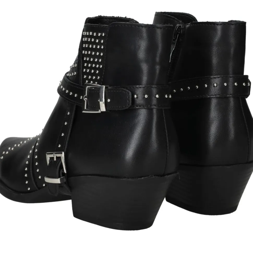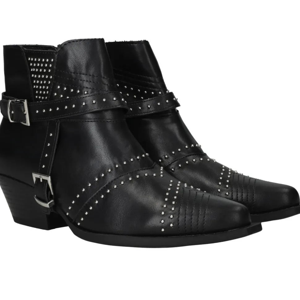 - Belangrijke kenmerken zijn de robuuste blokhak, de opvallende studs en de comfortabele zool.