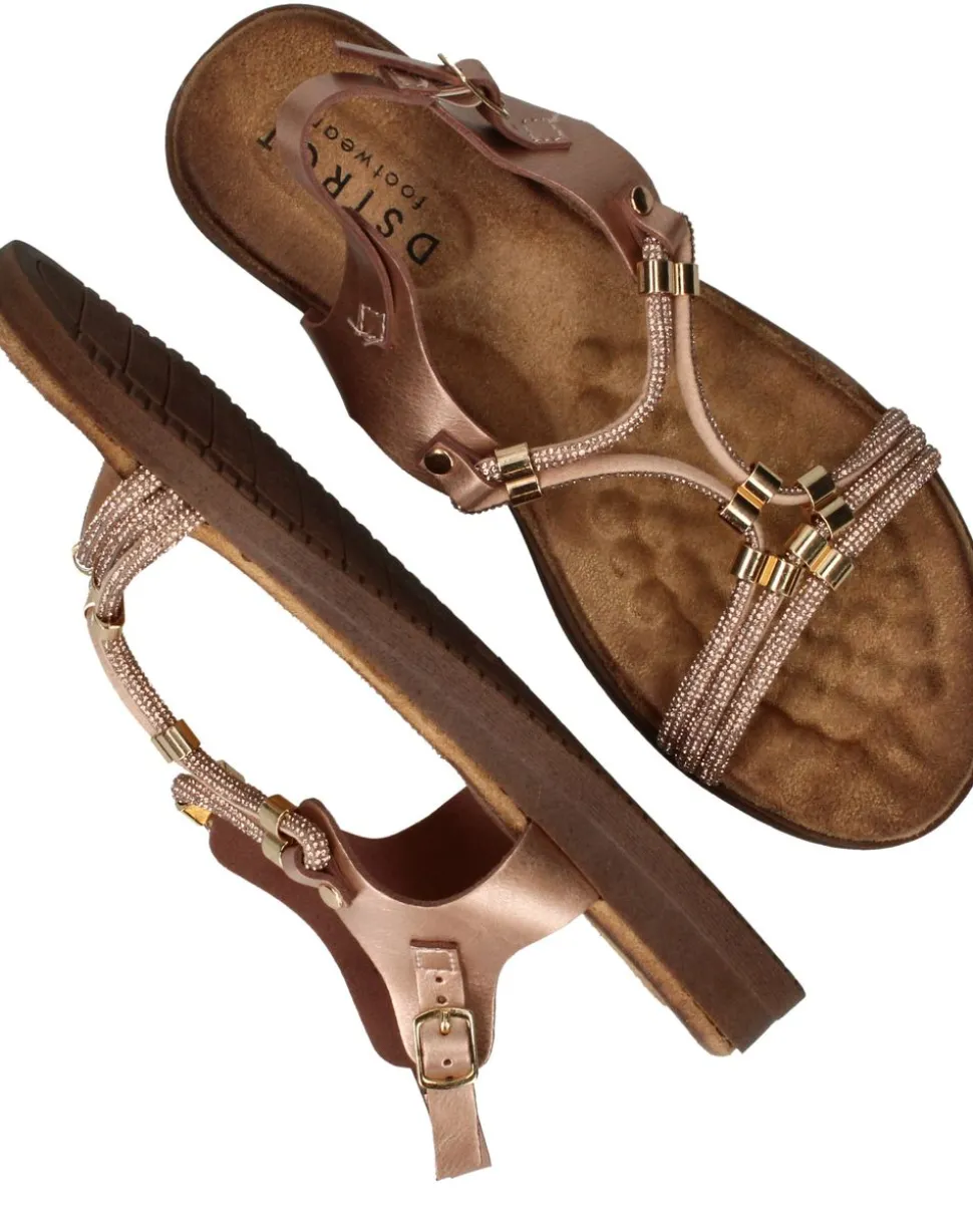 Deze vrouwelijke sandaal is een schitterende keuze voor warme dagen en zomeravonden. Het model is uitgevoerd in rosé metallic met fijne bandjes en goudkleurige details, wat zorgt voor een sierlijke en elegante uitstraling. Dankzij het zachte voetbed en de flexibele zool geniet je van optimaal comfort, of je nu gaat wandelen of een terrasje pakt. Een perfecte sandaal voor elke zomerse gelegenheid!