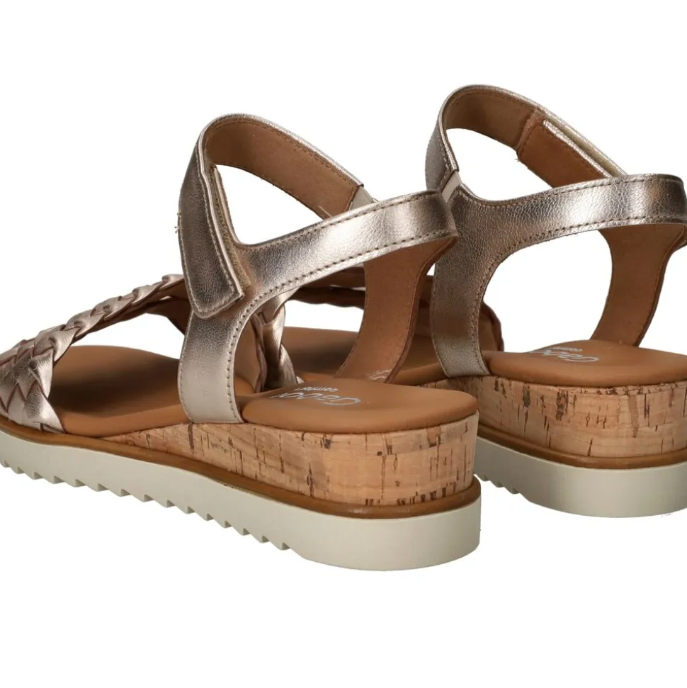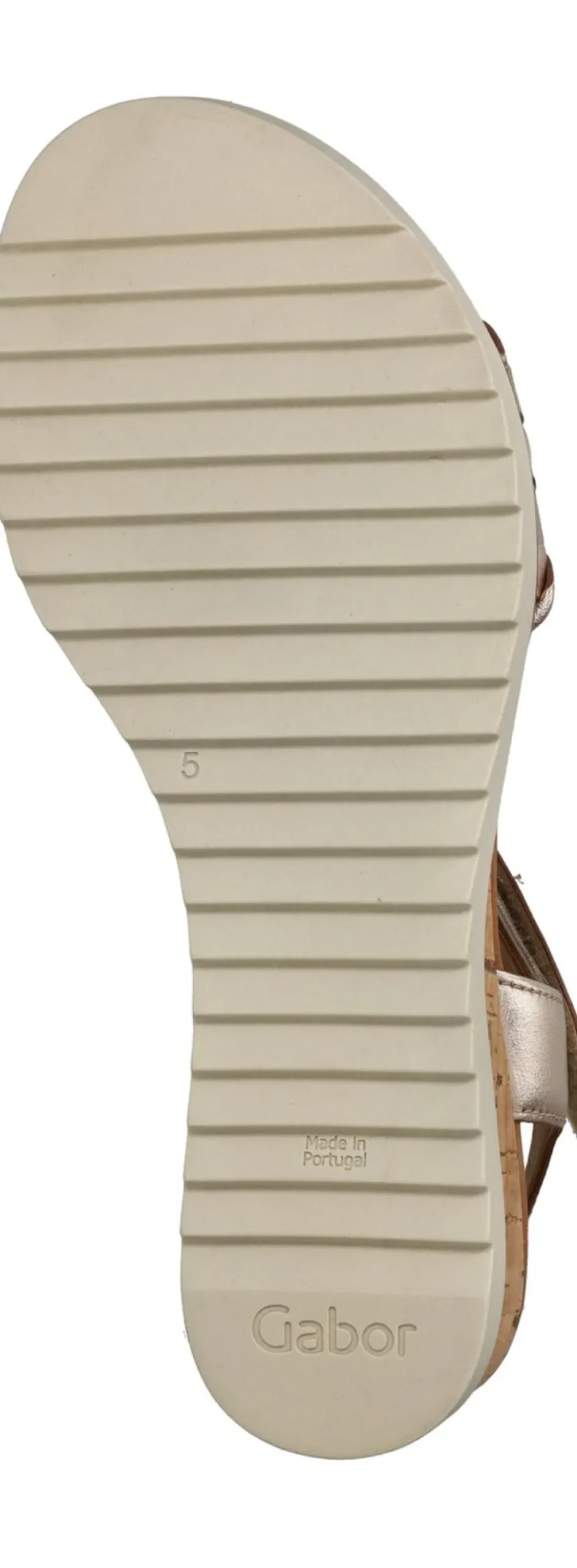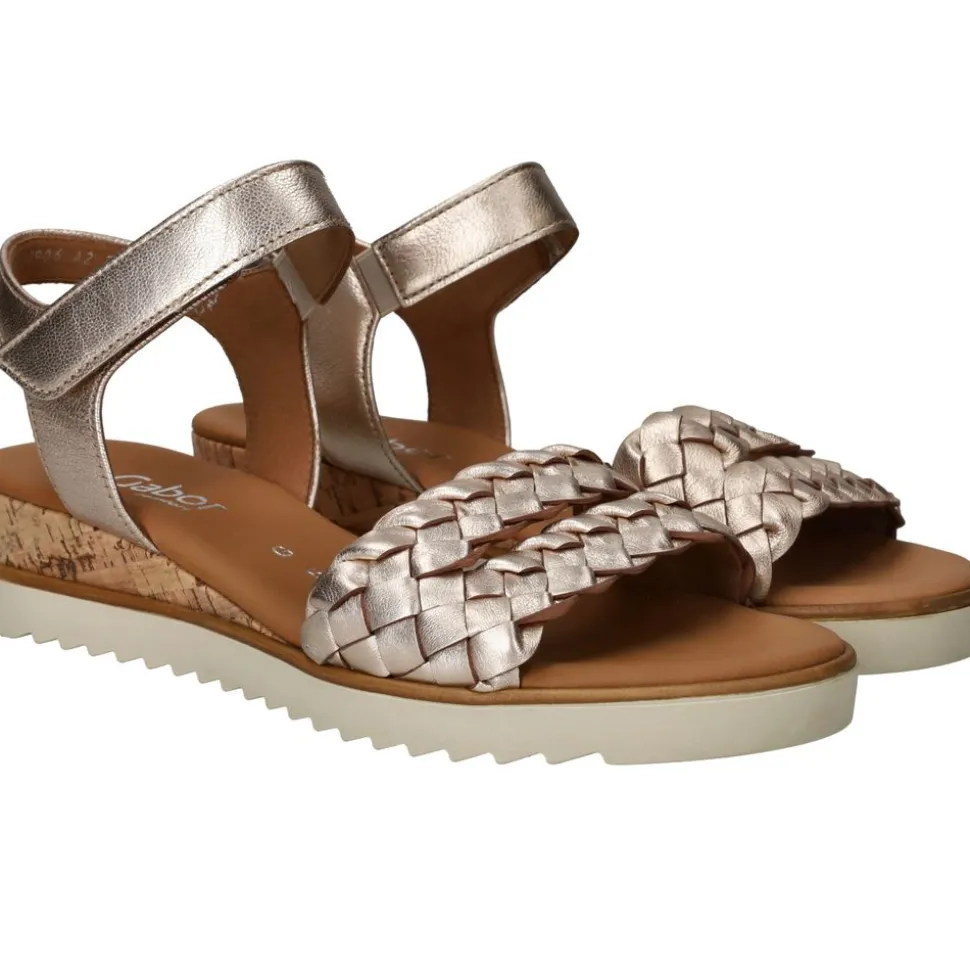 Deze zomerse sandaal van Gabor straalt elegantie en comfort uit. Het model is uitgevoerd in metallic goudkleurig leer met een speelse gevlochten band over de voorvoet. De kurklook hak en de lichte, flexibele zool zorgen voor een luchtige en comfortabele loopervaring. Perfect voor een stijlvolle zomerdag of een gezellige avond op het terras!