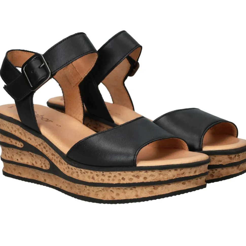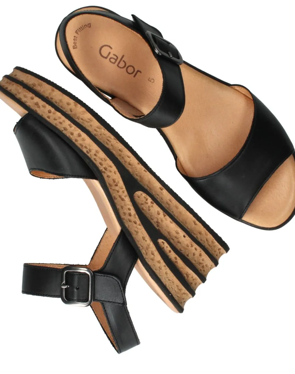 Deze stijlvolle sleehak sandaal van Gabor is de perfecte keuze voor een zomerse en moderne look. Het model is uitgevoerd in donkerblauw leer en heeft een speelse kurklook sleehak met opengewerkte details. Dankzij de zachte binnenzool en de stabiele hak geniet je van optimaal comfort, zelfs tijdens lange zomerse dagen. Ideaal voor zowel casual als chique gelegenheden!