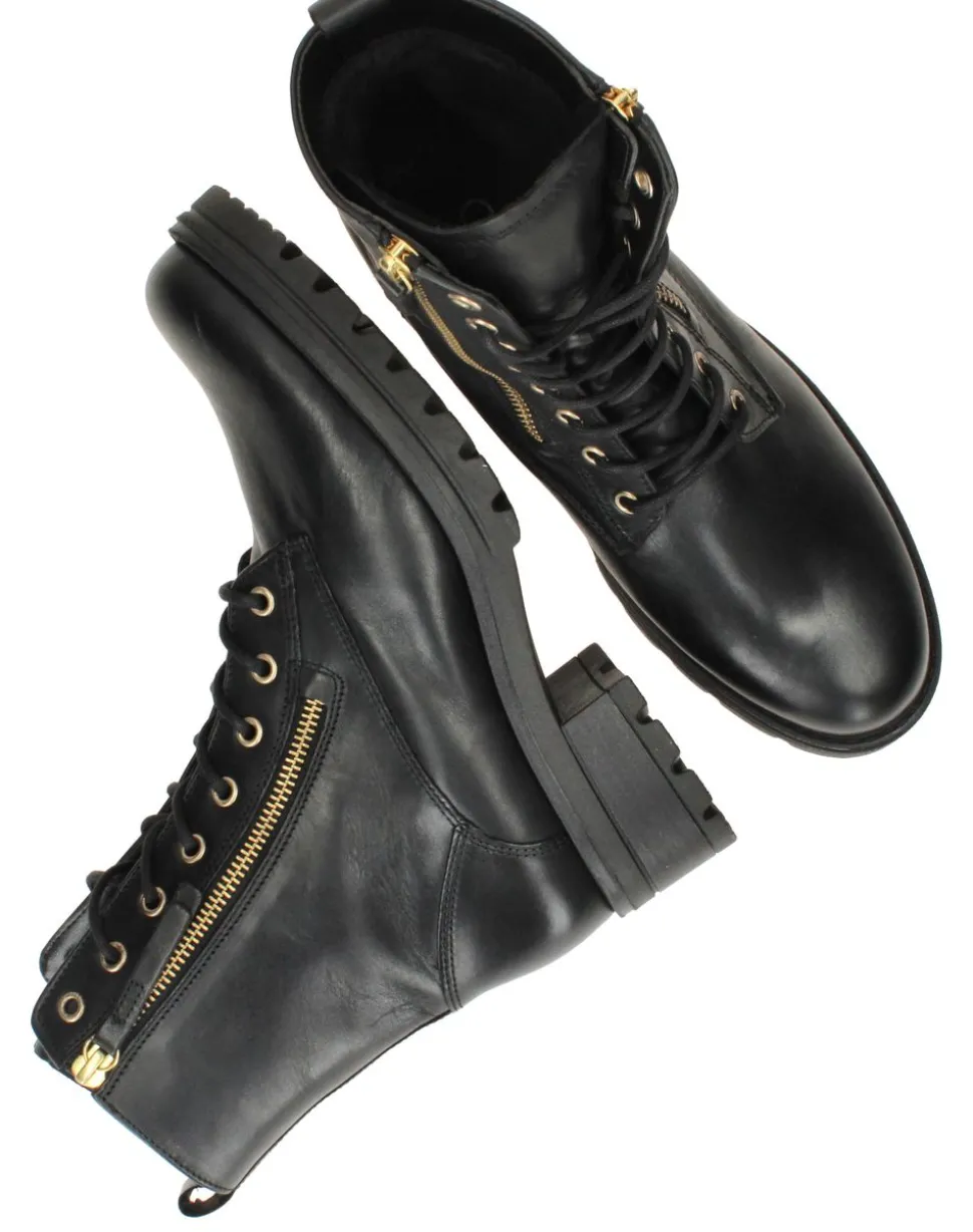 De veterboots zijn een stoere en stijlvolle keuze voor dames die comfort en mode willen combineren. Deze zwarte zijn uitgevoerd in hoogwaardig leer en hebben een robuuste zool die zorgt voor extra grip en stabiliteit. De combinatie van veters en een opvallende goudkleurige ritssluiting maakt de laars praktisch én modieus.