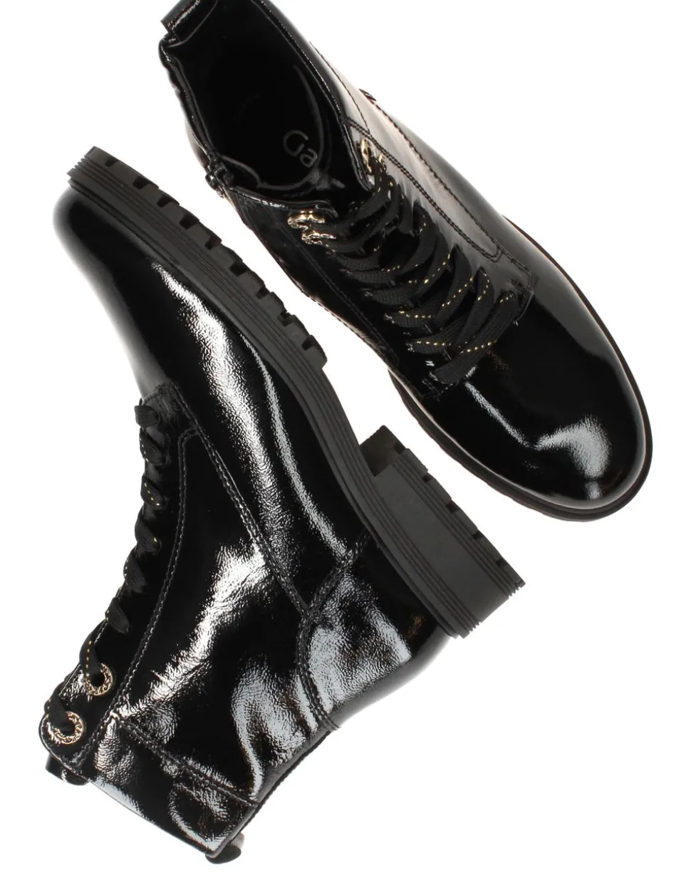 De veterboots zijn een stijlvolle keuze voor dames die comfort en mode willen combineren. Deze zwarte zijn uitgevoerd in lakleer en hebben een H-voetbreedte, waardoor ze ook geschikt zijn voor bredere voeten. De glanzende afwerking en robuuste profielzool maken ze ideaal voor zowel dagelijks gebruik als voor een trendy uitstraling.