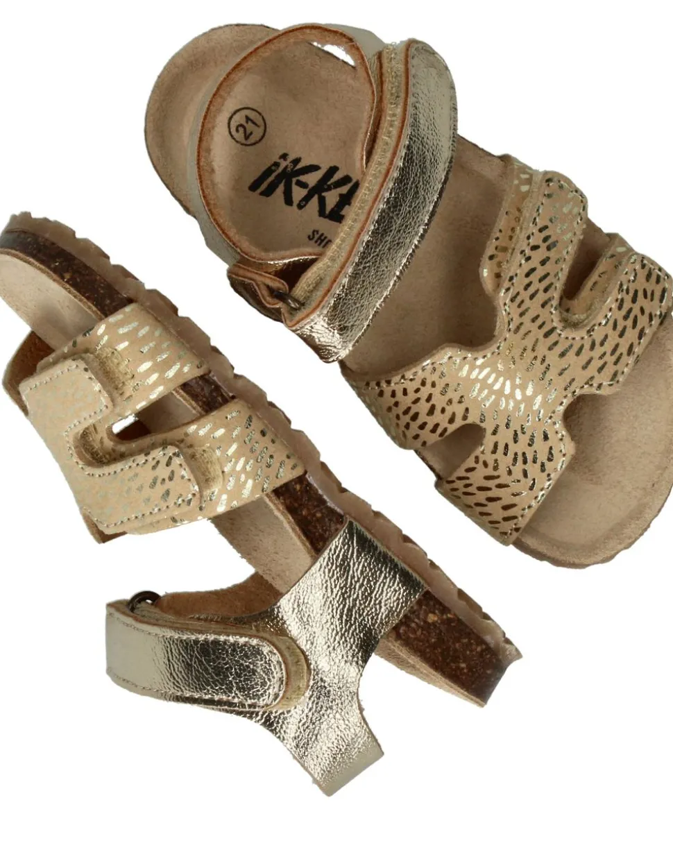 Deze goudkleurige van geven elke outfit van jouw kleine meid een feestelijke touch. Het glanzende kunstleer en de subtiele textuur zorgen voor een speelse, stralende uitstraling. Dankzij de klittenbandsluitingen kunnen kinderen ze helemaal zelf aan- en uittrekken. Het zachte voetbed en de flexibele kurkzool zorgen voor fijn draagcomfort, ideaal voor eindeloze zomerdagen vol plezier.