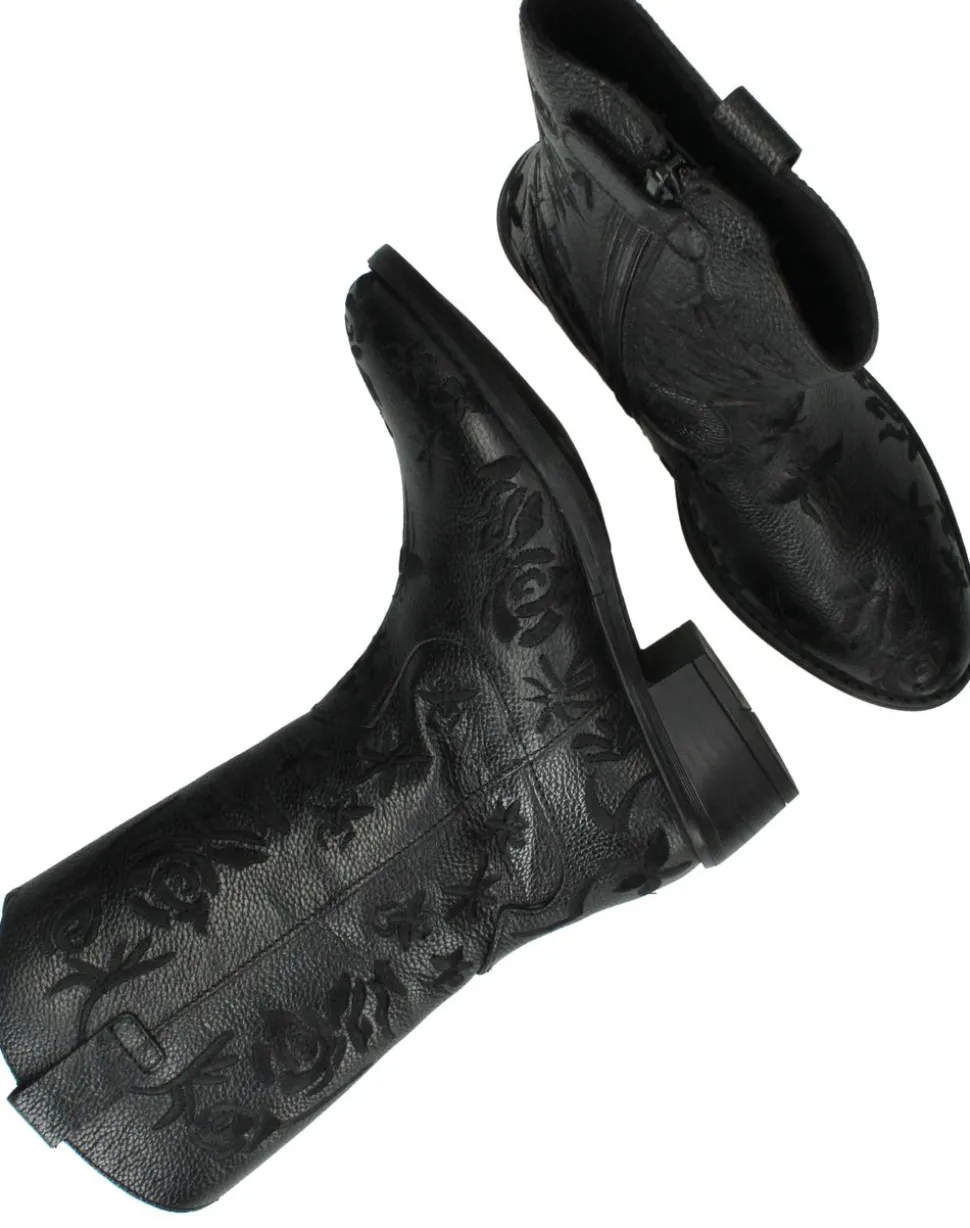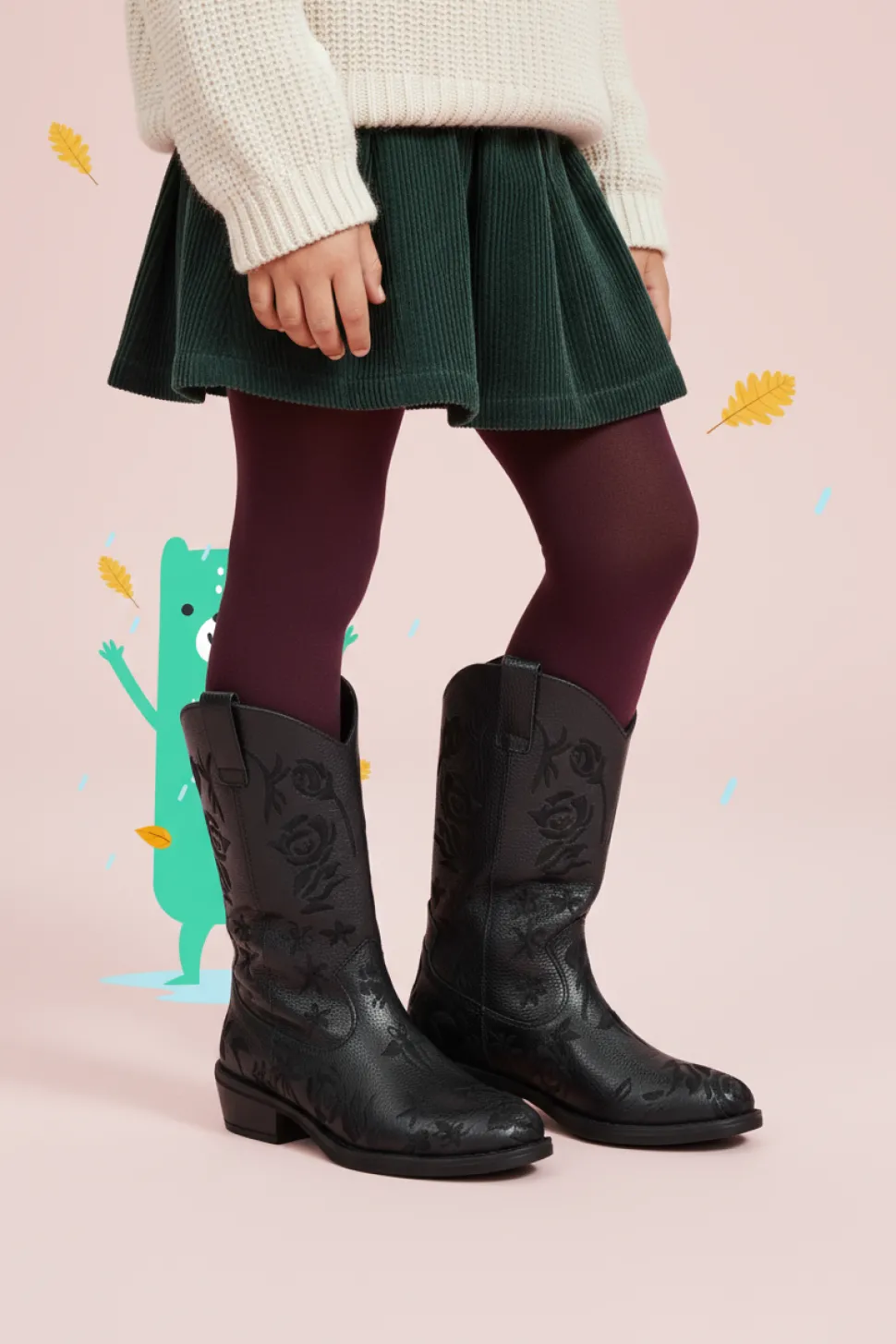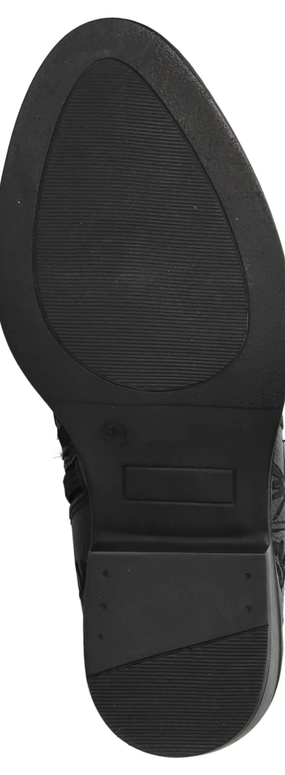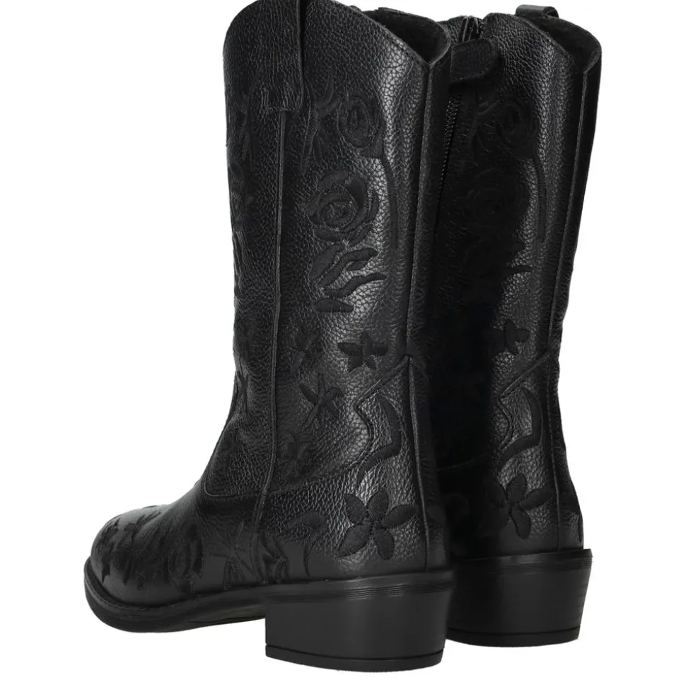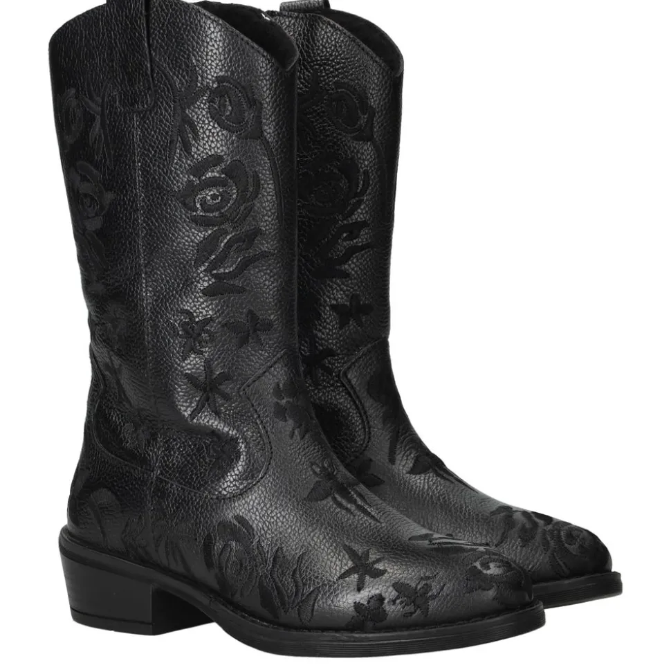 Deze stoere zwarte van zijn een echte eyecatcher voor meiden met stijl. Het leer is prachtig afgewerkt met bloemenmotief en de stevige hak zorgt voor een trendy westernlook. Dankzij het uitneembare voetbed zijn ze niet alleen mooi, maar ook supercomfortabel. Perfect voor school, feestjes of gewoon elke dag!