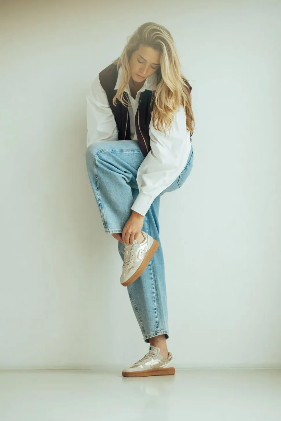 De voor dames is een stijlvolle mix van casual en chic. Het bovenwerk van suède en metallic leer zorgt voor een opvallende, luxueuze uitstraling. Dankzij de leren voering voelt de schoen prettig aan tijdens het dragen en blijf je de hele dag comfortabel lopen.