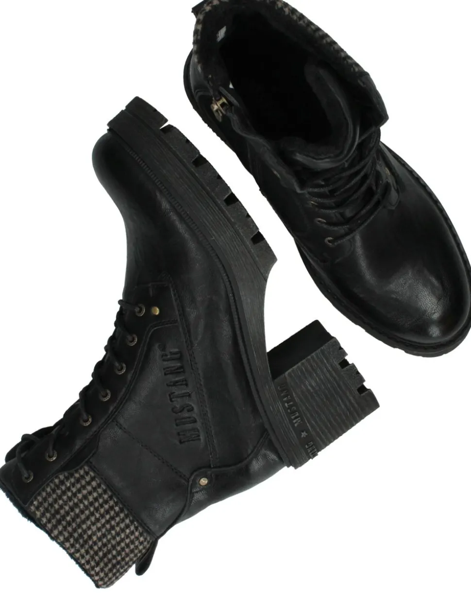 Deze zwarte van is gemaakt van duurzaam kunstleer en is voorzien van zowel een veter- als ritssluiting. Dankzij deze combinatie trek je de boots gemakkelijk aan en uit, terwijl de stevige zool zorgt voor een goede grip. Perfect voor dagelijks gebruik tijdens de koudere dagen.
