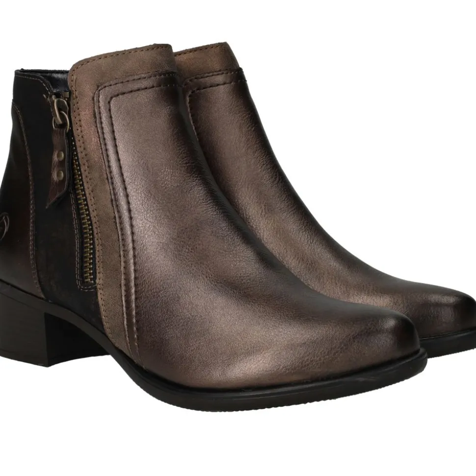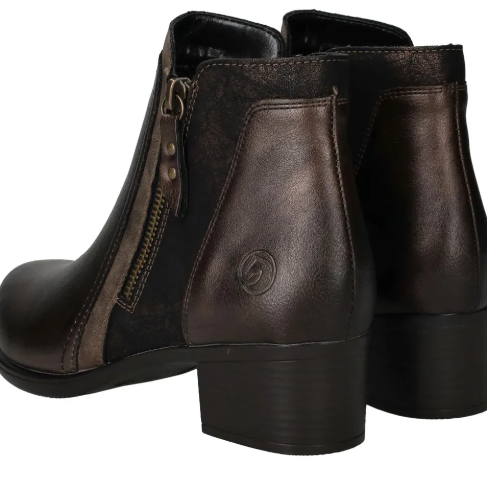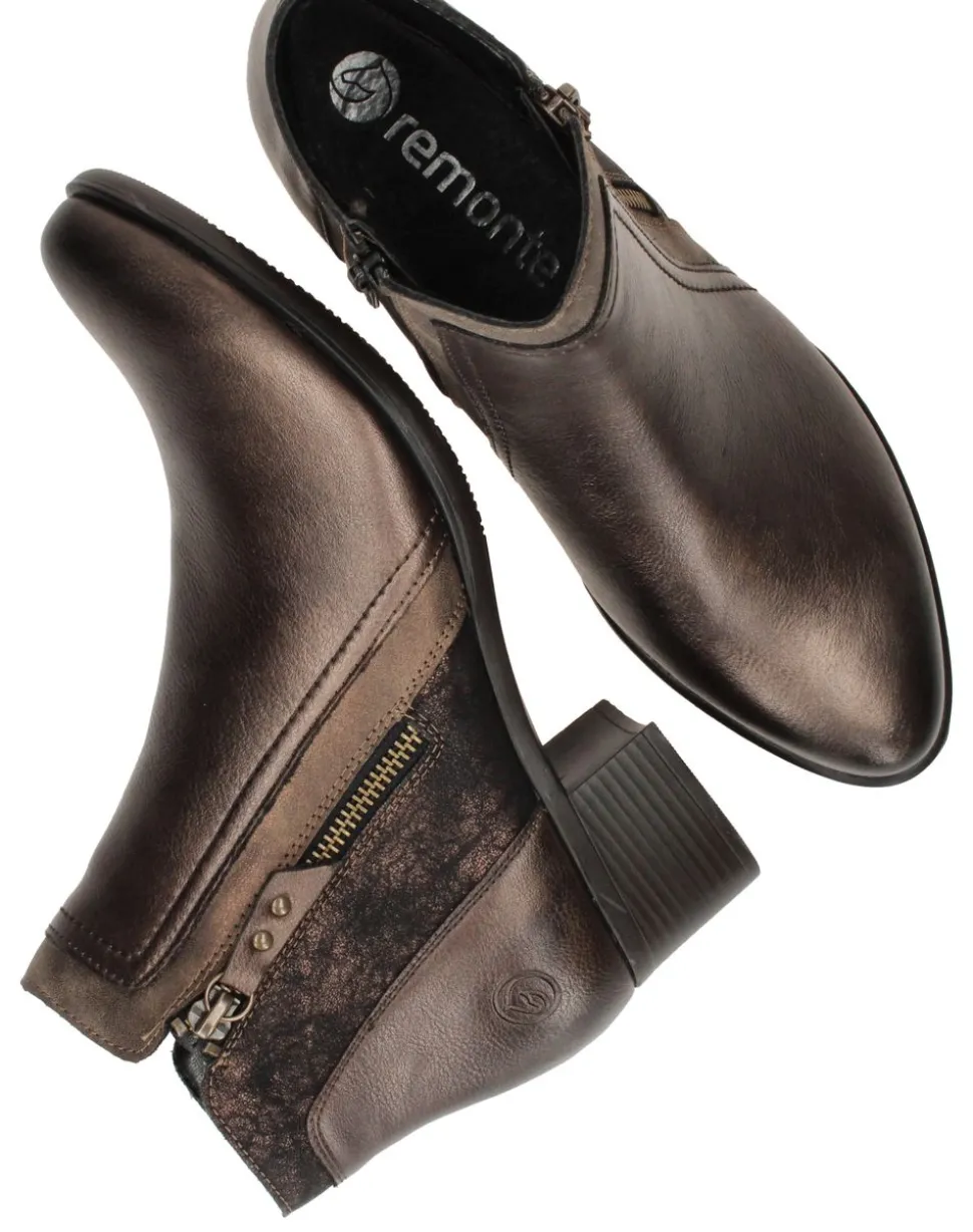 Deze Remonte enkellaars is uitgevoerd in metallic goud en is gemaakt van een combinatie van leer en kunstleer. De laars heeft een comfortabele pasvorm en is gemakkelijk aan- en uit te trekken dankzij de ritssluiting. De subtiele hak zorgt voor een elegante uitstraling, ideaal om zowel casual als netjes te dragen.
