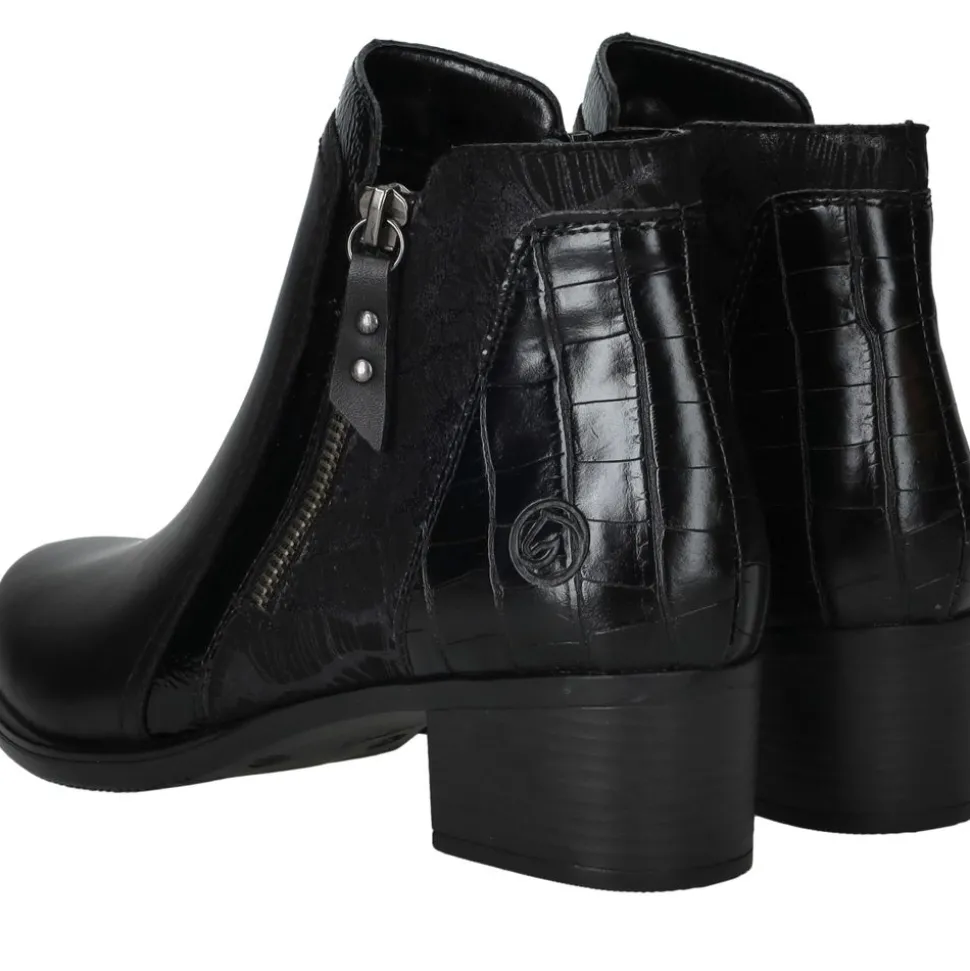 Deze elegante in zwart leer en textiel zijn een veelzijdige en stijlvolle keuze. Het subtiele contrast tussen het gladde leer en het textiele detail geeft de laarsjes een unieke en moderne uitstraling. De stevige hak biedt stabiliteit en comfort, terwijl de comfortabele zorgt voor een fijne pasvorm. Perfect voor die mode en praktisch gemak willen combineren.