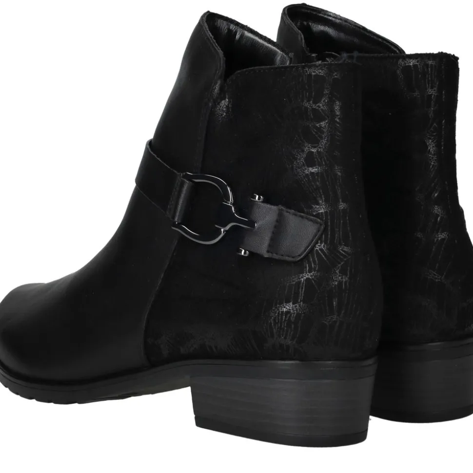 Deze elegante in zwart leer en textiel zijn een stijlvolle en veelzijdige keuze. Het gladde leer aan de voorkant en het subtiele textielpatroon aan de achterkant geven de laarsjes een moderne en luxe uitstraling. Dankzij de comfortabele geniet je van een prettige pasvorm. Perfect voor die mode en comfort willen combineren.