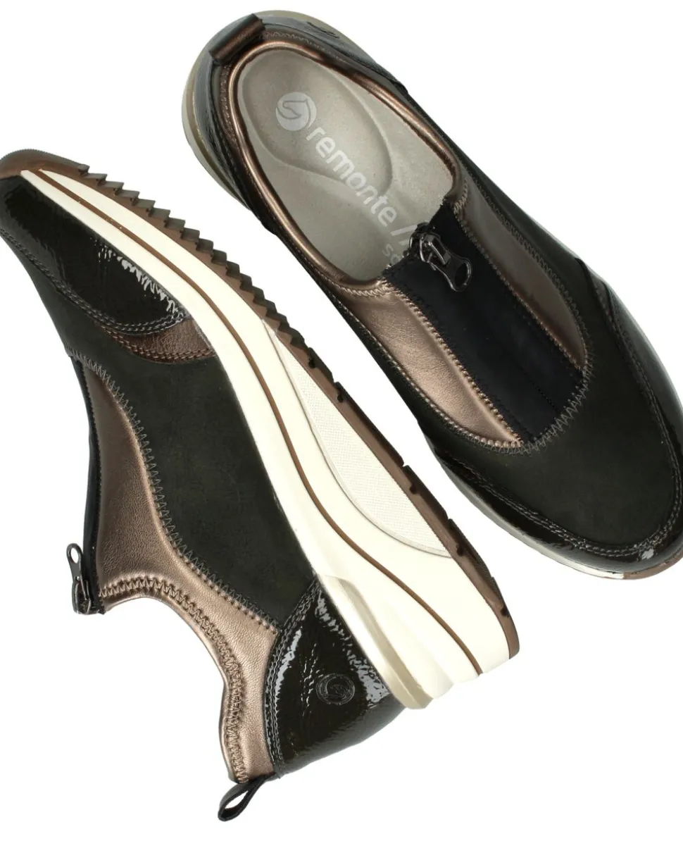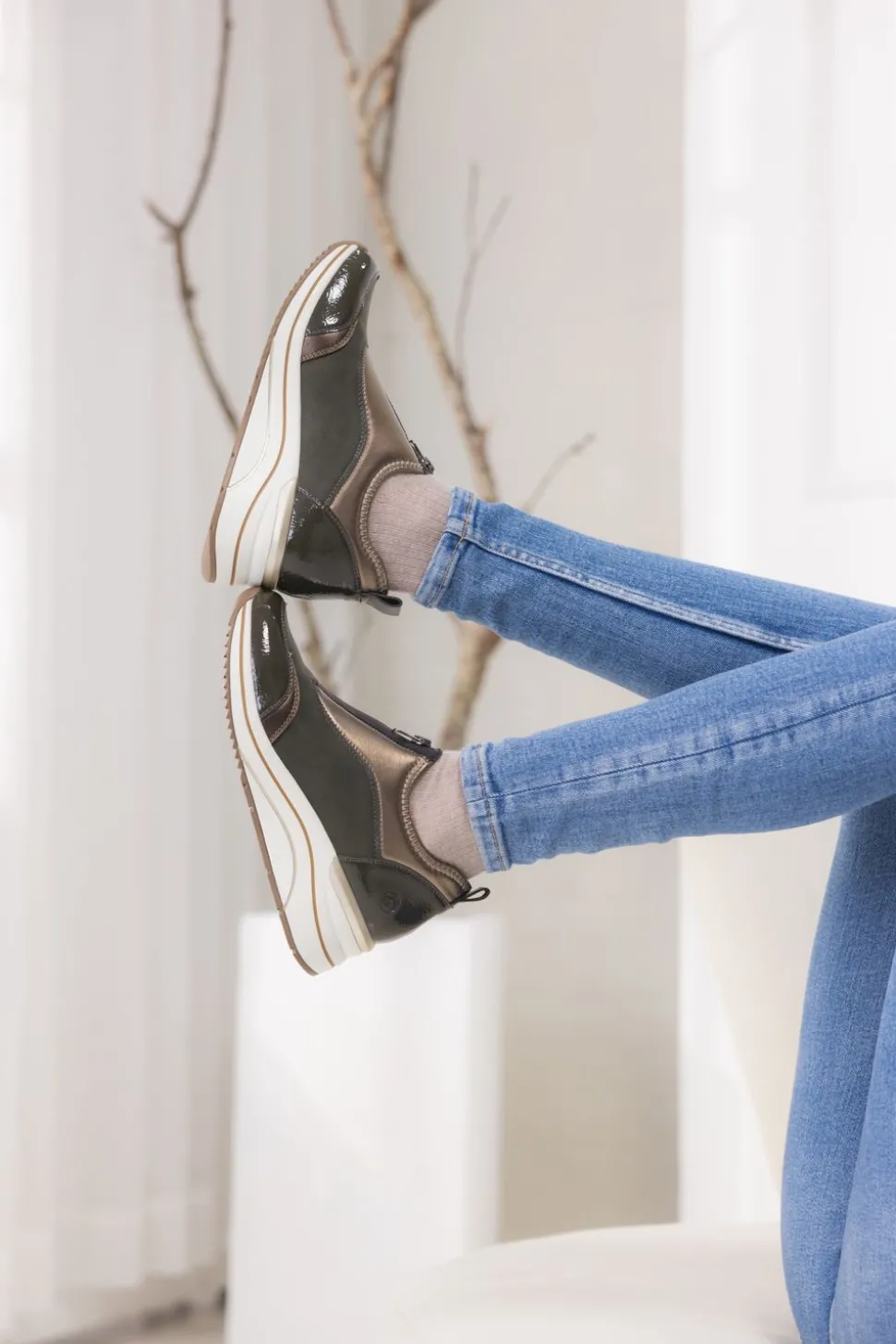 Deze groene van is een comfortabele en stijlvolle keuze voor dames met een bredere voet. De combinatie van vegan materialen, glanzend lakdetail en een ritssluiting zorgt voor gemak en een modieuze uitstraling. Dankzij de Lite’n Soft binnenzool loop je de hele dag moeiteloos rond.