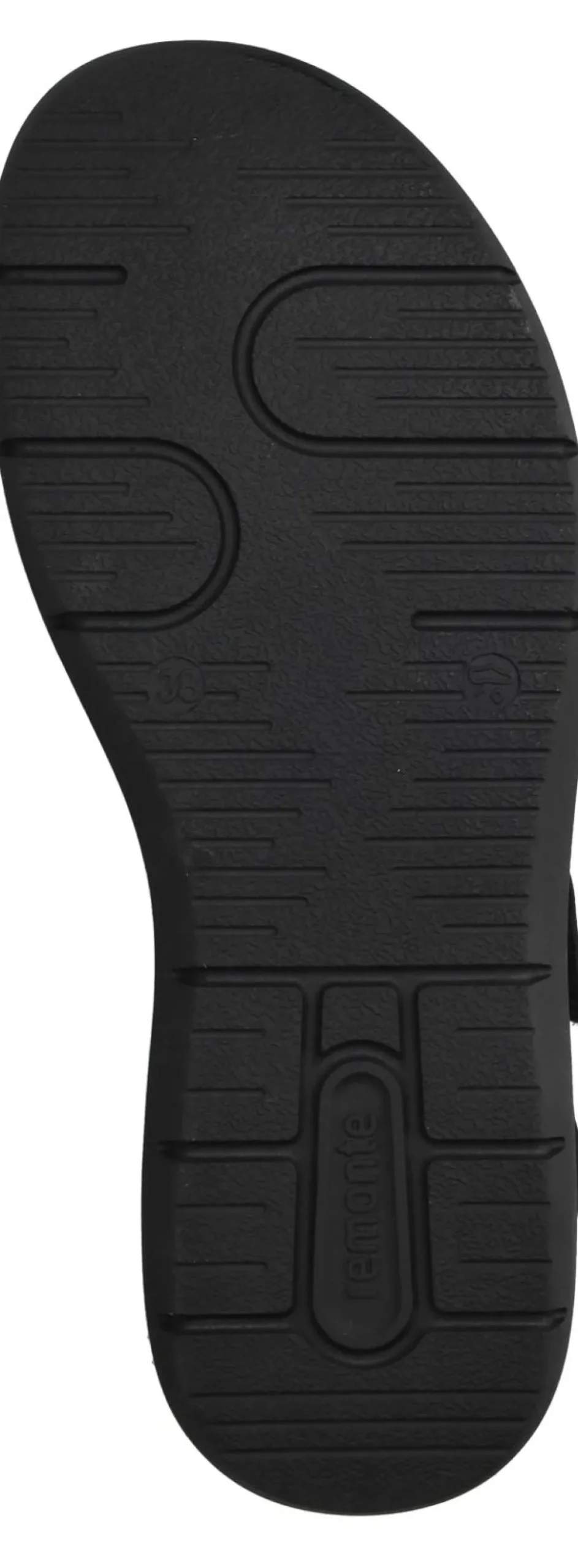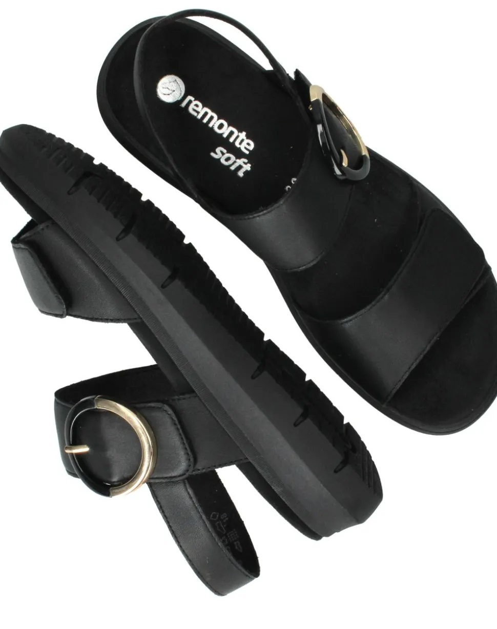 Deze zwarte sandaal van Remonte biedt een perfecte balans tussen comfort en een stijlvolle, moderne uitstraling. Het model is uitgevoerd in zwart leer en afgewerkt met een opvallende gouden ring, wat zorgt voor een eigentijdse en vrouwelijke touch. Dankzij de Lite ’n Soft zool geniet je van lichtgewicht comfort en uitstekende demping. Ideaal voor dagelijks gebruik of een zomerse avond uit!