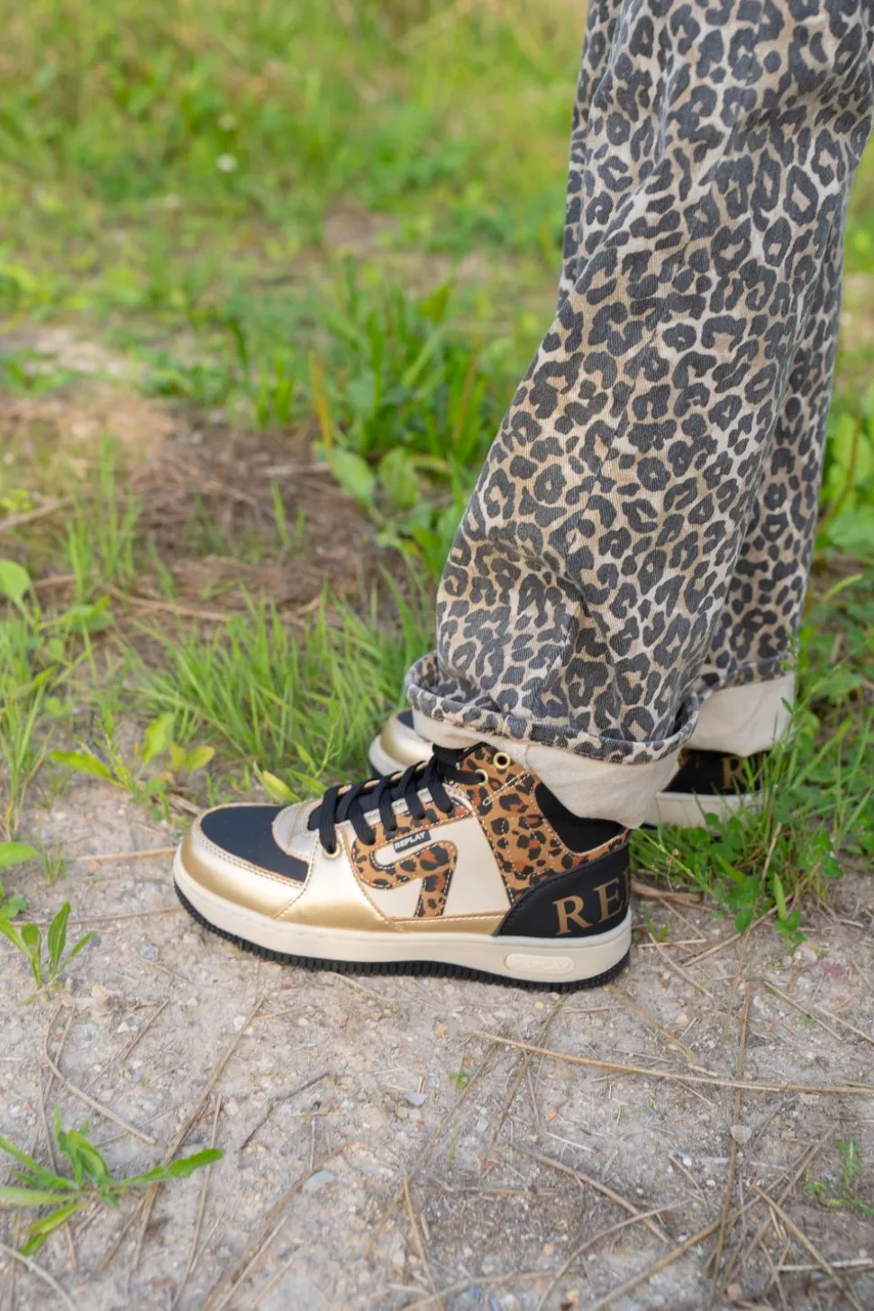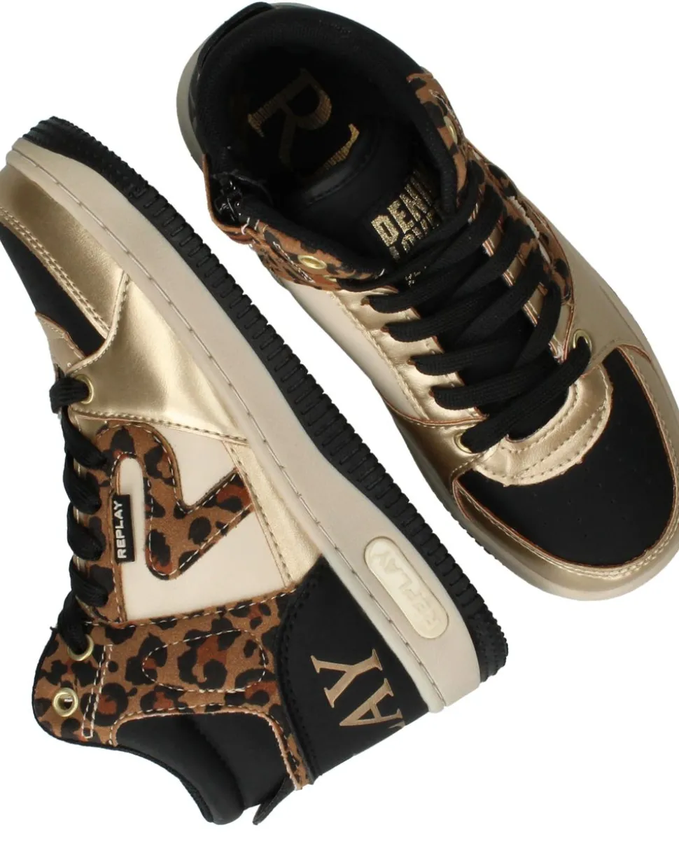 De Replay Epic JR 20 is een trendy meisjessneaker met een unieke mix van kleuren en materialen. Uitgevoerd in goud, zwart en panterprint, is deze sneaker een echte blikvanger. Het uitneembare voetbed zorgt voor extra comfort, terwijl de combinatie van veters en rits de schoen makkelijk aan- en uittrekbaar maakt. Gemaakt van hoogwaardig kunstleer voor een duurzame en modieuze uitstraling.