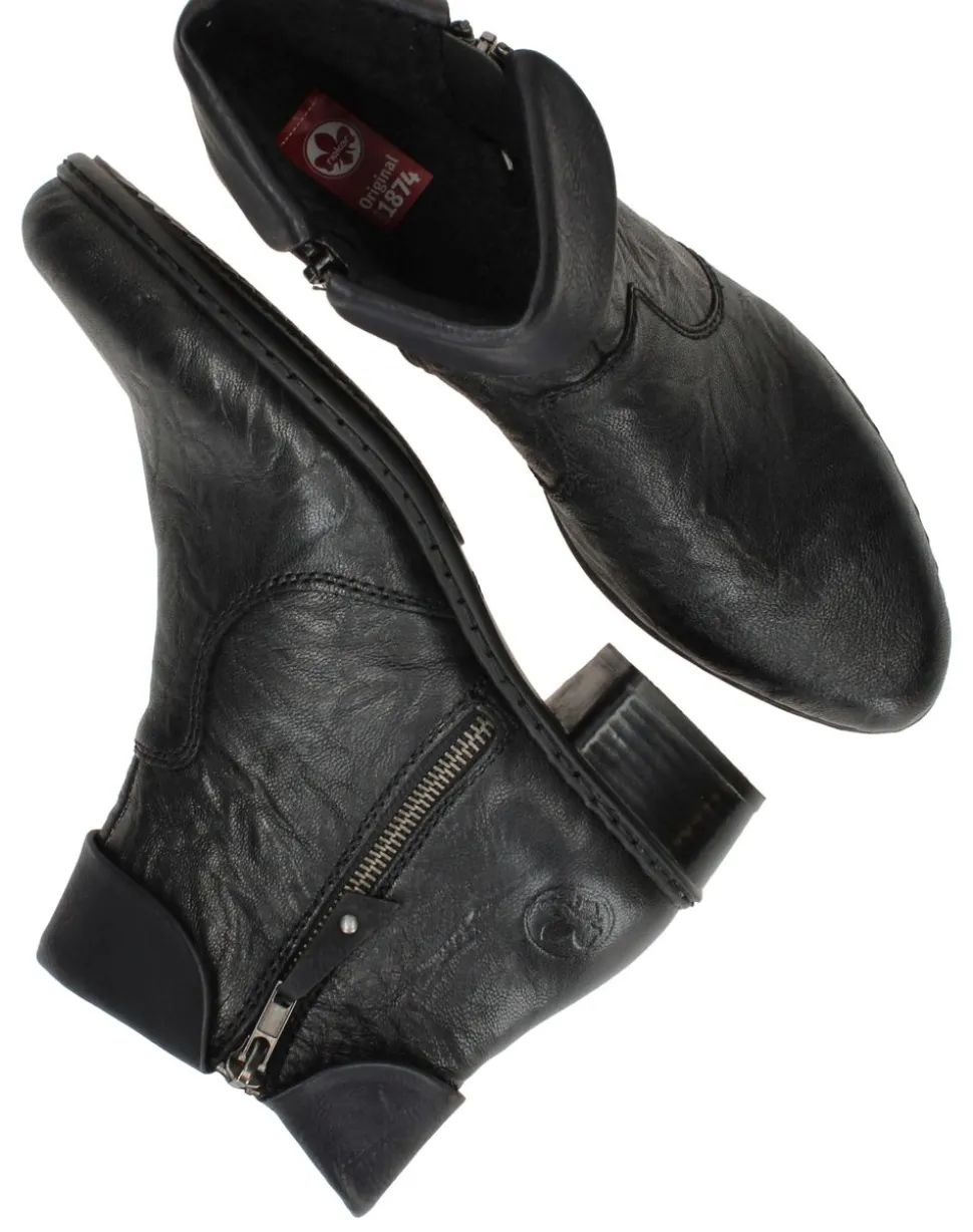 Dit zwarte Rieker enkellaarsje is gemaakt van glad leer en heeft een elegante uitstraling. Dankzij de comfortabele pasvorm en de rits aan de zijkant trek je de laarsjes eenvoudig aan en uit. Ideaal voor dagelijks gebruik en perfect te combineren met verschillende outfits.