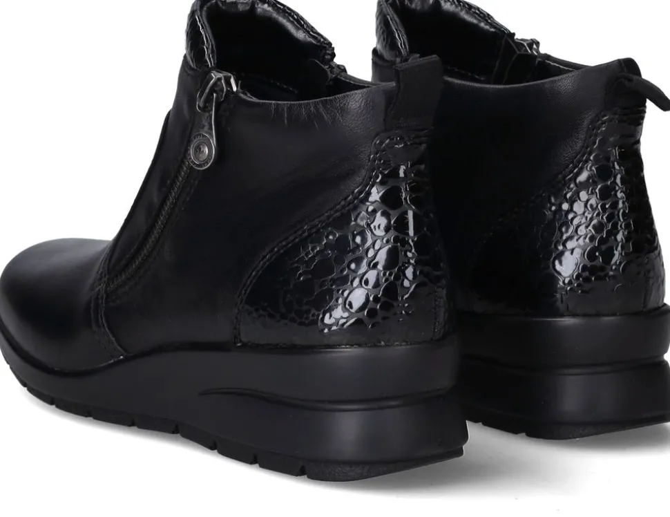 Deze zwarte van combineren klassiek leer met een moderne twist. De glanzende afwerking en de subtiele structuur op de hiel zorgen voor een verfijnde uitstraling. Dankzij de comfortabele pasvorm is dit een ideale keuze voor die een iets smallere, maar toch comfortabele schoen zoeken. De dubbele rits maakt instappen extra makkelijk.