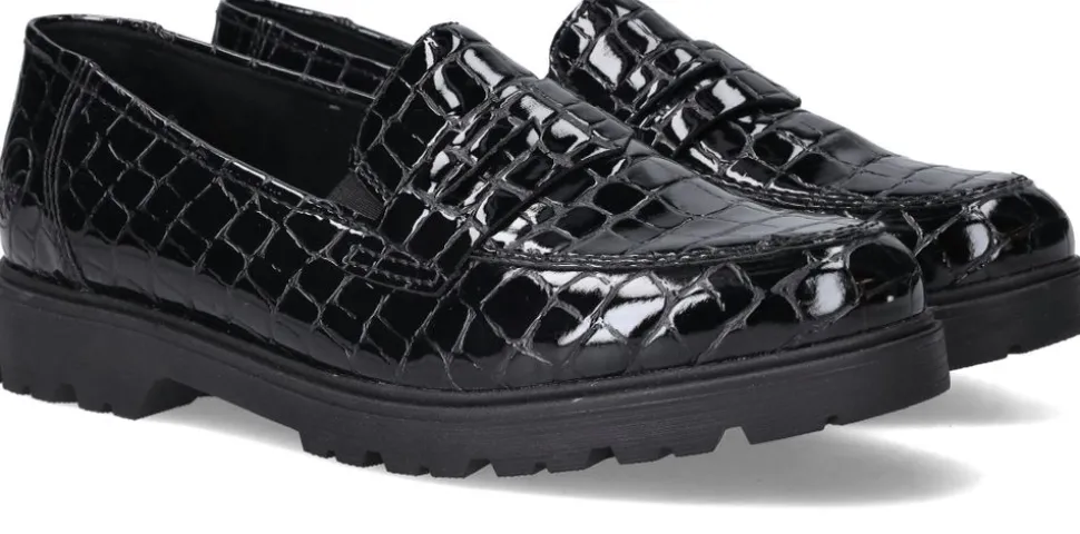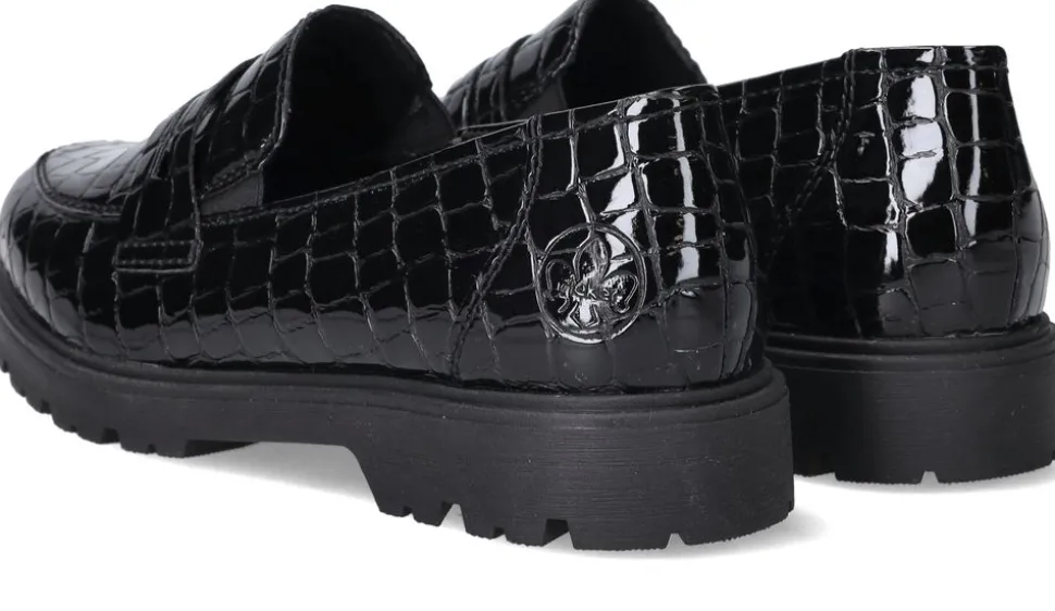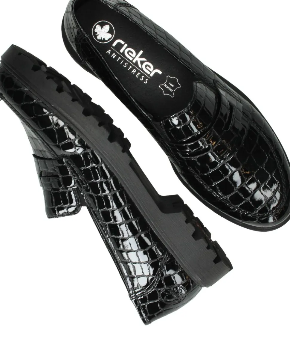 Op zoek naar een elegante die direct opvalt? Deze zwarte loafers van Rieker combineren klasse met comfort. De glanzende krokolook in lak-kunstleer maakt elke outfit stijlvol, of je ze nu draagt naar kantoor of een etentje. Perfect voor met een smallere voetbreedte F die niet willen inleveren op modegevoel.